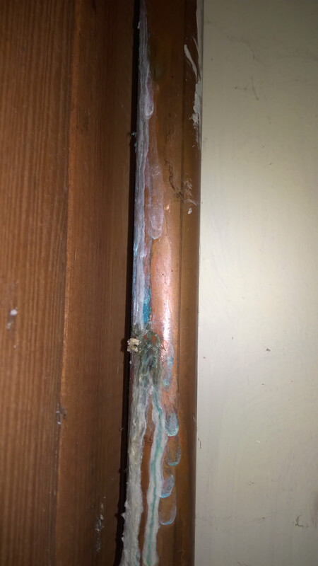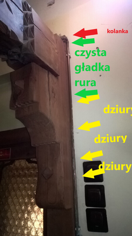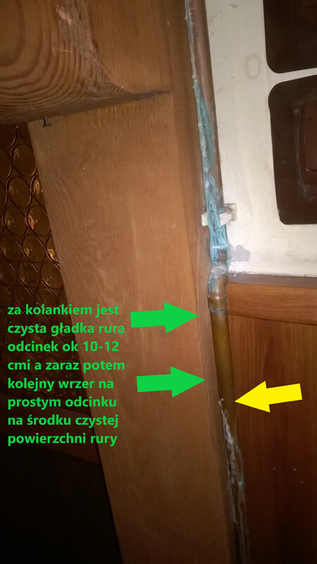 4. Witajcie. Te zacieki które wyglądają jakby szły z góry to właśnie zacieki od pierwszego miejsca gdzie powstała nieszczelność. Zrobiłem fotkę , w miejscu gdzie już nad tą dziurą są dwie dziury wyżej. Dlatego tak widać jakby na te miejsca z dziurami coś się wylewało z góry. To jest prosty pionowy odcinek o długości ok 1,3 metra i na nim od mniej więcej 50-go centymetra powstały widoczne wżery. Rura do miejsca gdzie powstały perforacje jest czysta i gładka. Gdyby była zabrudzona pastą lutowniczą lub jakimś żrącym preparatem to byłaby cała zielona i matowa jak papier ścierny. Co ciekawe dwa kolanka które są powyżej i poniżej tych nieszczelności takich dziur nie mają i wszystko gra. Co według mnie chyba powinno być na odwrót że to na kolankach miedzianych przeważnie jak słyszałem ścinaki są wypłukiwane od wewnątrz i tam lubią robić się dziury. Poniżej są też dwa kolanka ale one dziur nie mają tylko są zaśniedziałe od tego co się na nie sączyło. Natomiast poniżej kolanek jest znowu dziura na gładkiej czystej powierzchni. Tak to wygląda z bliska.