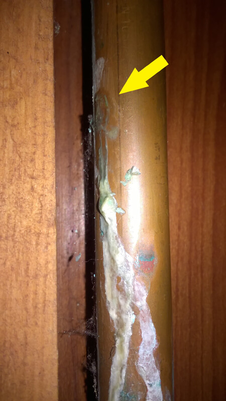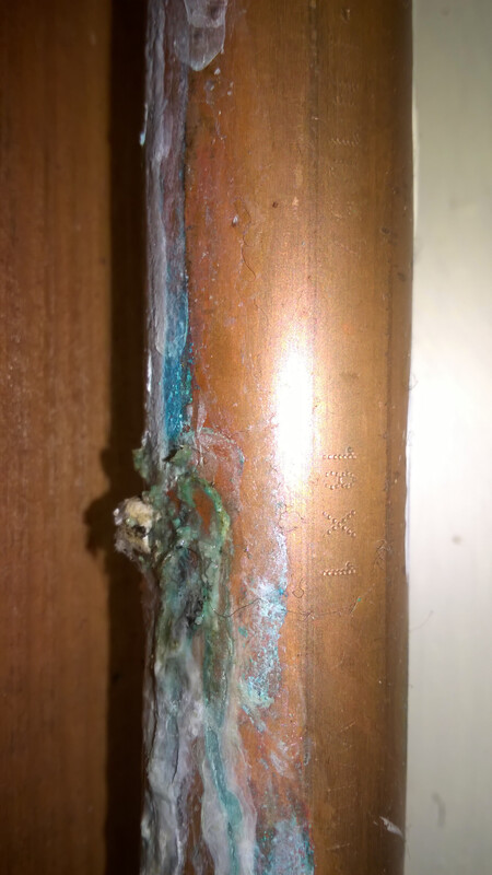 3. Kiedy się usunie taki gruby nalot to widać pod nim gładką rurę z mikroskopijną jakby "zmarszczka" i to nie jest okrągła dziurka jak od szpilki. Jest to jakby ryska, która jest na dodatek trudna do uchwycenia telefonem, ale która ewidentnie jest dziurą przez którą sączy się woda. Luty obmacałem ze wszystkich stron i "są pełne" suche i czyste bez wycieków i wżerów. Także to nie wchodzi w rachubę.