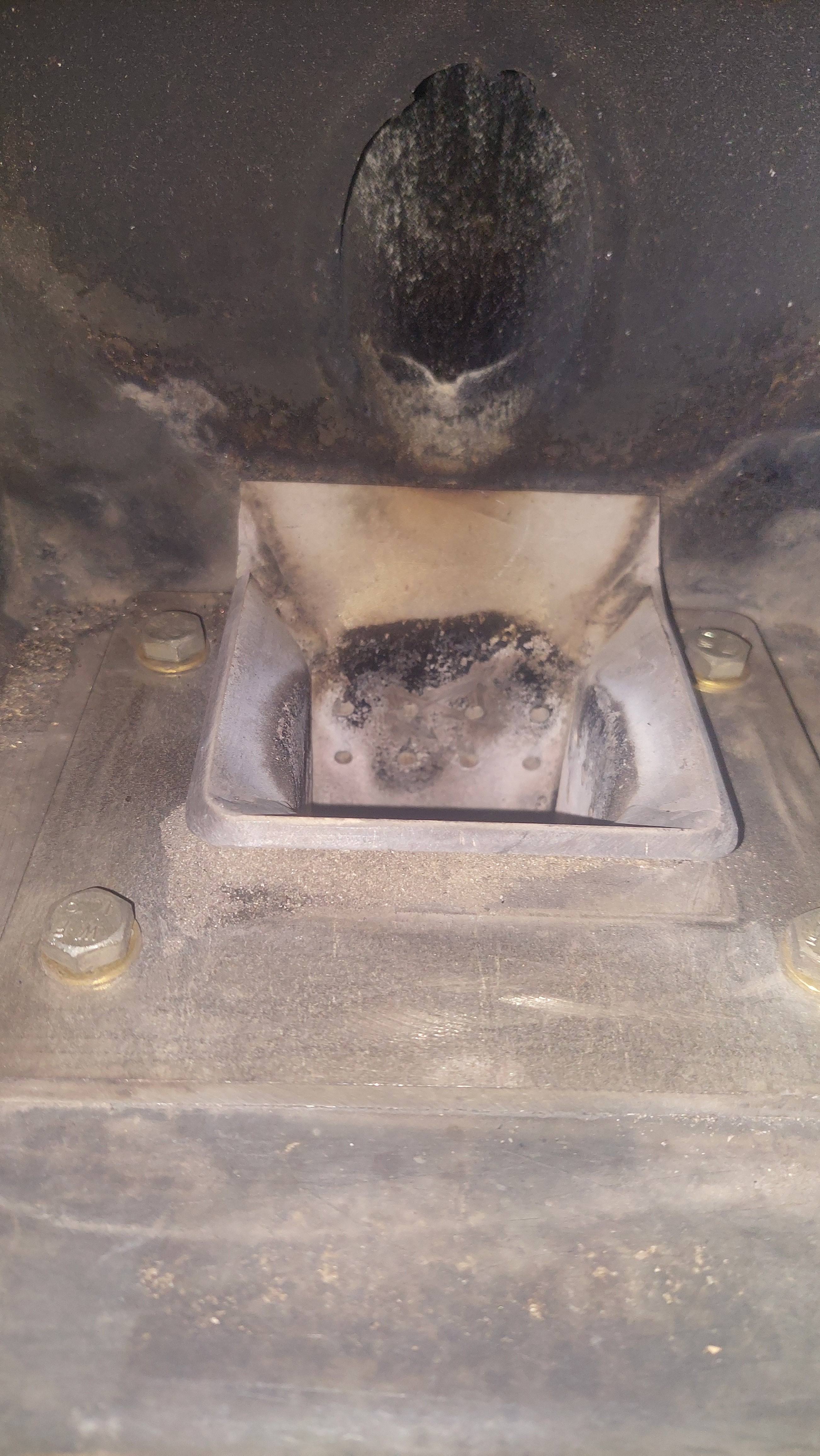 We wnętrzu komory spalania, (trzeba się przyjrzeć, drugie zdjęcie) też jakby są zalążki tej smoły. W co tygodniowy czyszczeniu w popielniku są resztki niedopalonego pelletu. Popiół nie jest do końca czarny, nie jest zbrylony, powiedział bym że brązowawy z elementami szarych drobinek. Płomień jest dziwny, nie pali się punktowo, jest dosyć szeroki, wysoki, na pewno poszarpany.