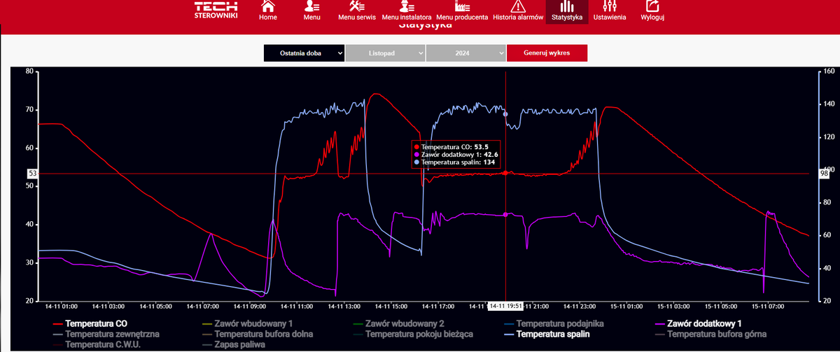 8. Dodatkowo wykres eModul, wzrost temperatury zbiega się dopiero po osiągnięciu temp. zadanej na regulatorze pokojowym 23,5 st. C i po wyłączeniu się pomp obiegowych grup pompowych. Na buforze ustawienia temp. góra 65 st. C dół 60 st. C. Pompy załączają się przy 50 st. C.