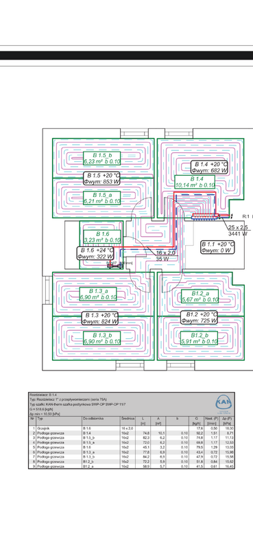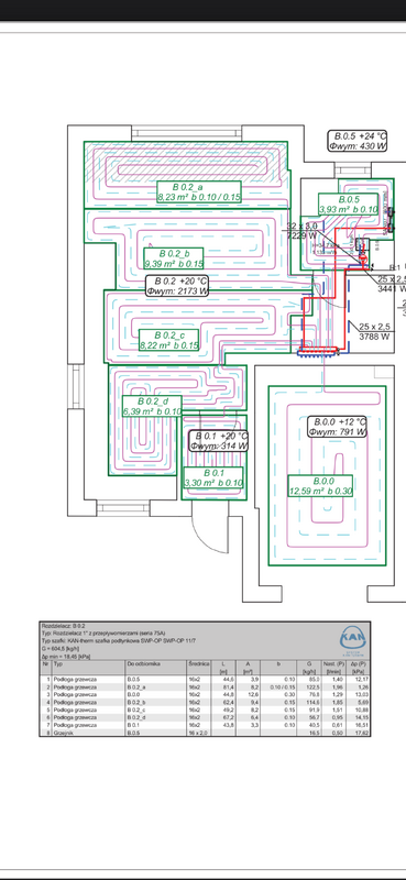 a mówią że łódzka woda najlepsza… ktoś mi mówił że ona jest bogata w minerały dlatego tak wygląda… Myślę że ten zawór założyli z rozpędu, budowali osiedle 34 takich samych domów, w części były same grzejniki, w części mieszane, u mnie są 2 grzejnik może myśleli że będą używać na wysokich temperaturach, ale nie wiem. Czy usunięcie zaworu 3-d realnie wpłynie na komfort ciepłej podłogi lub zużycie gazu? Będę musieli do tego wezwać hydraulika 🙂 Jeszcze jest piętro z taka samą ilością pętli, zaworem i pompką. Niestety deweloper stracił projekt podłogówki, przesłał nam zbliżony z poprzedniego etapu, u mnie pomieszczenie B00 nie ma ogrzewania podłogowego a jedynie grzejnik. Nie mam czujnika zewnetrznego, mam termostat modulowalny podłączony do internetu, który siedzą temperaturę dla mojej lokalizacji. Piec ma deltę zasilania i powrotu tylko 3 stopnie i nie można tego zmienić, zauważyłam, że dość często mam deltę 1-2 stopnie, obawiam się że ustawienie stałej temperatur może nie spowodować ciągłej pracy kotła przy nie zmienionych innych czynnikach, bo piec będzie się wyłączał przez niską deltę. Nie mówię nie, przetestuję to rozwiązane kiedy temperatura na zewnątrz się ustabilizuje koło 0 bo ostatnie dwa dni są dość dziwne, mieliśmy +12 w ciągu dnia. -