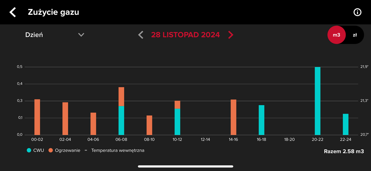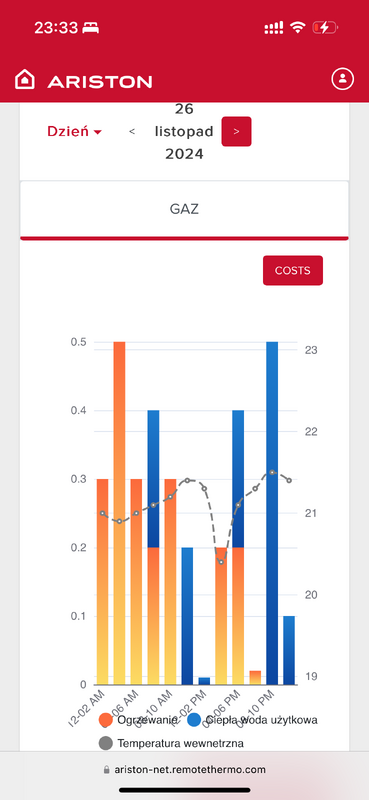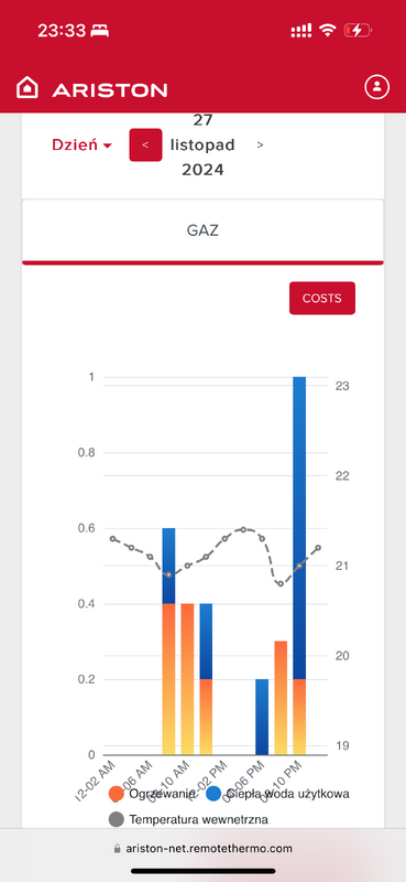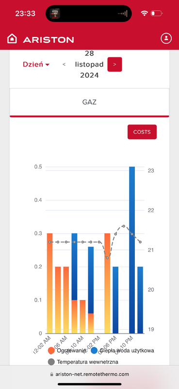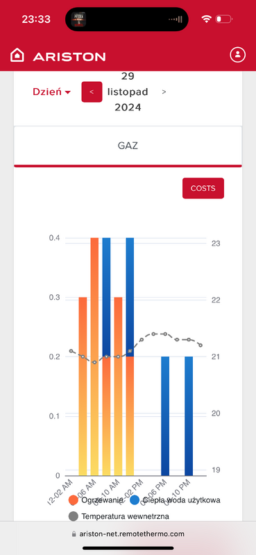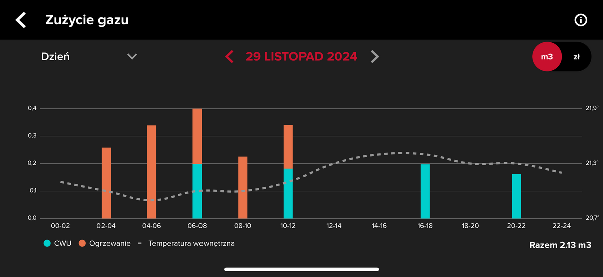 Nie zmieniałam żadnych ustawień. Obecnie są takie: Parametr Wartość Krzywa grzewcza 0,3 Przesunięcie krzywej 0 Minimalna temperatura 20 Harmonogram temperatury Dzień: 21 Noc: 21 Bieg pompy 2 Temperatura zewnętrzna 28.11/28.11 6/4 Zużycie gazu 28.11- 1,25; 29.11 -1,2 Poniżej zamieszczam wykresy za dwa dni prezentują te same dane na dwa sposoby. Dzisiaj udało mi się zaobserwować dwa ostatnie cykle pieca 11:02 włączył się 11:03 wyłączył się i przeszedł na postcyrkulacje, powód temperatura powrotu 24, temp zasilania 24, zadana 24 (pomieszczenia 21) 11:06 włączył się, zszedł z mocą na minimum 11:10 włączył się, temp pomieszczenia 23,3, już się nie włączył. -
