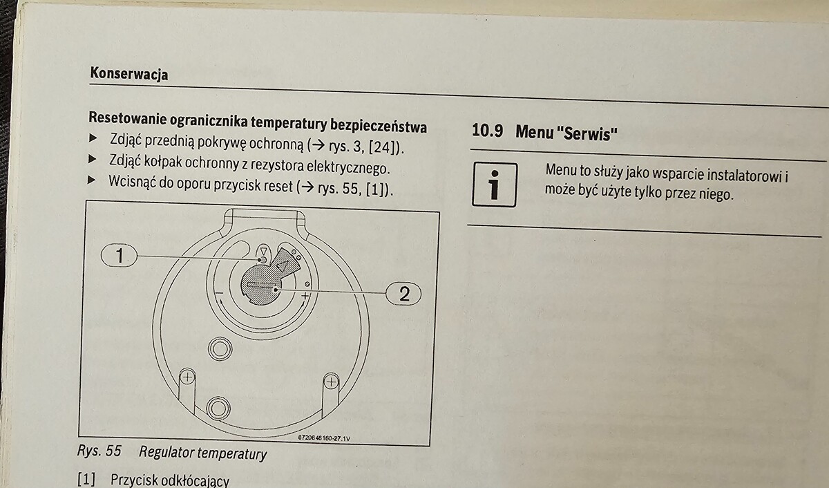 1. Witam. Pompa ciepła CWU z wężownicą, przegiołem z temperaturą, wyskoczył kod błędu E04 -Temperatura w podgrzewaczu wynosi  80 °C W instrukcji pisze - Resetowanie ogranicznika temperatury bezpieczeństwa ▶ Zdjąć przednią pokrywę ochronną ( rys. 3, [24]). ▶ Zdjąć kołpak ochronny z rezystora elektrycznego. ▶ Wcisnąć do oporu przycisk reset ( rys. 51, [1]). gdzie to jest ? Jak zresetować ? gdzie jest ten regulator temperatury ?