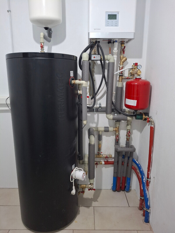 2. Hej. W nowo wybudowanym budynku, jeszcze nie zamieszkanym, zainstalowano nam instalację co {podłogówka} i cwu. Źródłem ciepła jest pompa powietrzna. Przedstawiam zdjęcie ze sposobem podłączenia. Podłogówka została już uruchomiona. W domu nie ma jeszcze żadnych innych podłączonych urządzeń, które zużywałyby wodę. Jednak licznik wody pobieranej z wodociągu cały czas chodzi. Dzienne zużycie wykazuje ok.340 litrów. Bardzo niepokoi nas ten fakt. Dla sprawdzenia zamknęliśmy na noc zawór główny poboru z wodociągu. Następnego dnia, po jego otwarciu, nastąpił natychmiastowy pobór wody i odpowietrzanie zbiornika cwu. Które urządzenie czerpie wodę? Co z nią się dzieję? Czy to jakaś nieszczelna instalacja? Hydraulik nas olał. Instalator od pompy twierdzi, że swoją instalację wykonał prawidłowo. Nawet nie wiemy co mamy robić. pozdrawiam Henryka