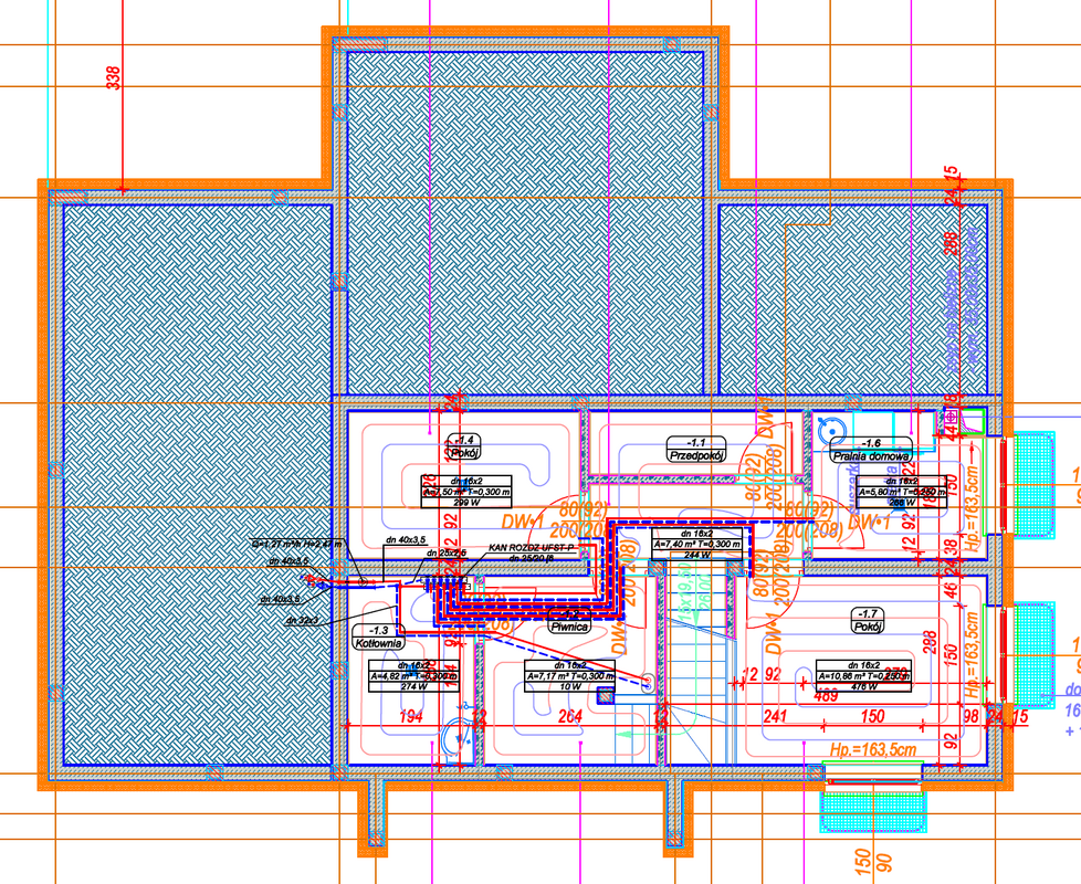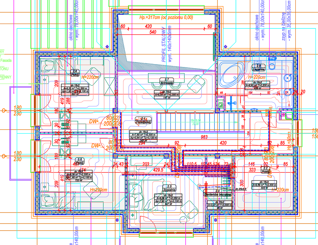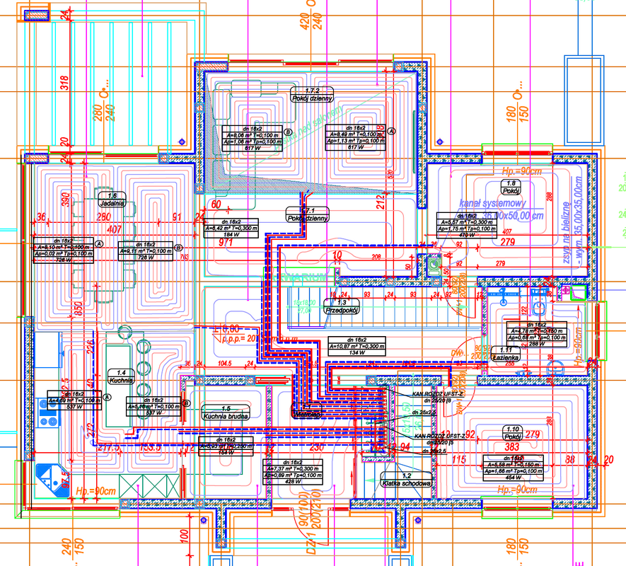Buduję dom i jestem na etapie: "za chwilę układanie ogrzewania podłogowego". Ponieważ pierwotny projekt nie zakładał ogrzewania podłogowego na całej powierzchni domu to zleciłem stworzenie takiego projektu. Niestety mój hydraulik, jego znajomi z którymi konsultował projekt oraz monter pompy twierdzą że ten projekt nie jest poprawny. Główne zastrzeżenia to: