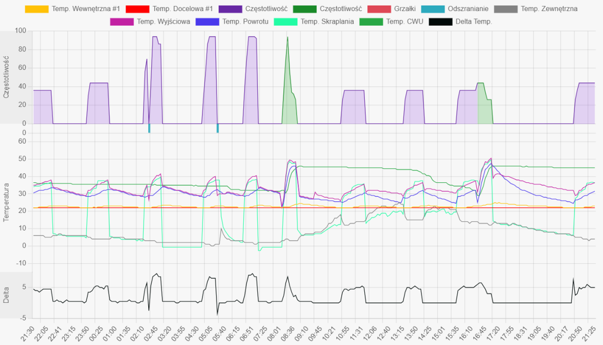 Witam. Potrzebuję pomocy. Otóż moja pompa Mitsubishi Zubadan 10kW z cylindrem  200 litrów od kilku dni grzeje dom na autoadaptacji. Na sterowniku pokojowym mam ustawione 22 stopnie i w tych granicach sterownik czyta temperaturę z pompy. Problem jest (jak widać na załączonej charakterystyce pracy) w tym, że po włączeniu grzania cwu rośnie temperatura w pomieszczeniu (Żółty wykres) z np 22 stopni do 24,5 a nawet 25 stopni, ale tylko na sterowniku na pompie natomiast na sterowniku pokojowym się nie zmienia, a nawet lekko spada bo przecież pompa grzeje wodę no i dalej jak wybije do góry to pompa nie przełącza się w grzanie bo pokazuje np 25 stopni mimo że grzała tylko CWU ale przypominam na sterowniku pokojowym jest 22 i niżej w miarę upływu czasu i w mieszkaniu się wychładza. Nie wiem czy wyraziłem swoją sytuację jasno. Czy coś jest żle ustawione czy skalibrowane. Dlaczego przy grzaniu cwu rośnie na pompie i wykresie temperatura pomieszczenia ?