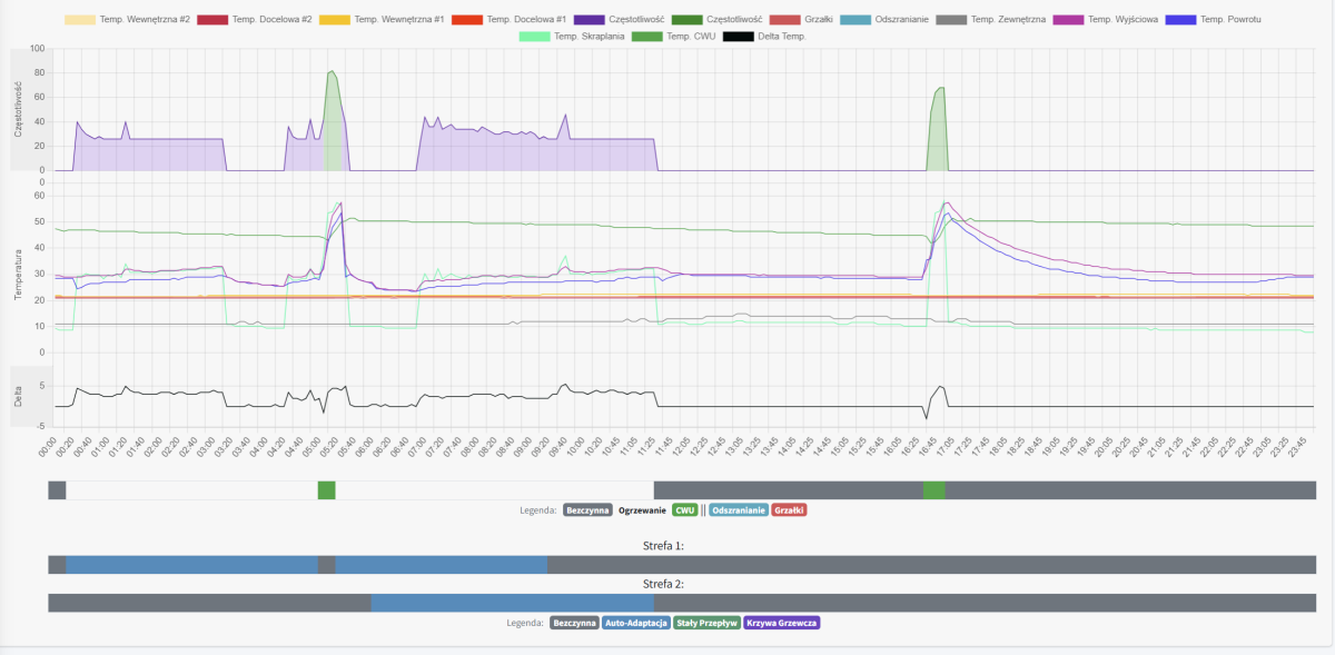 4. Delta utrzymuje się na poziomie 5-6 stopni, więc chyba nie jest źle. Ale i tak częstotliwość pracy wysoka. Na II biegu mam 14 l/min. Zmniejszyłem biegi pompek obiegowych o 1 (parter chodzi na 2 biegu, a parter+poddasze na 1). Poczekam ze 2 dni i zobaczę co będzie. Dobre rady w miedzyczasie mile widziane:)