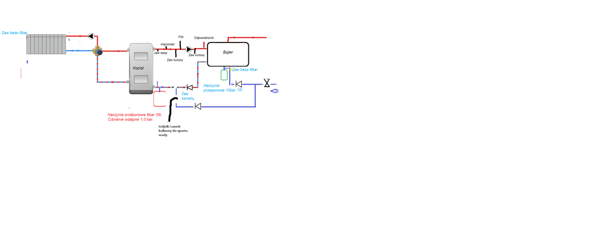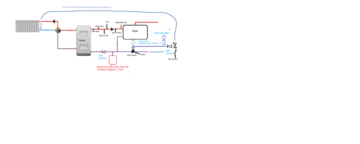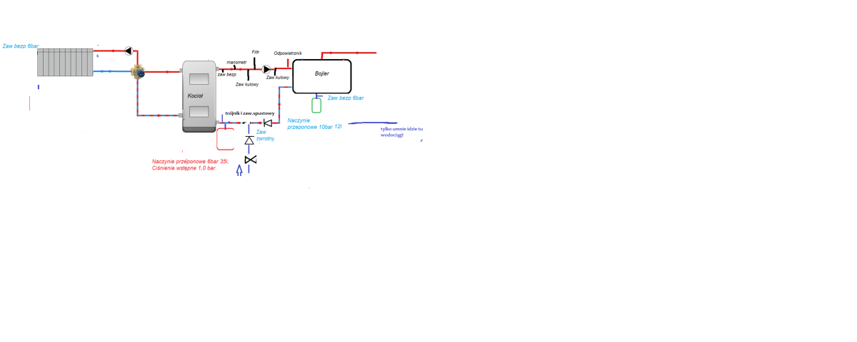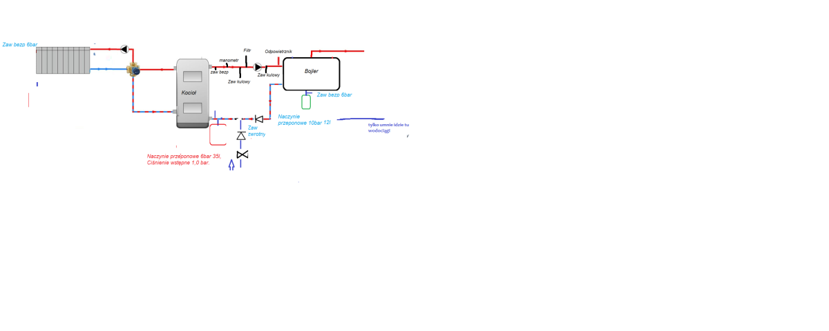 ok to w takim razie gdzie te naczynie przeponowe 10 bar 12l i naczynie przeponowe 6 bar 35l cisnienie wstepne 1.0bar jak by pan miał czas to poprosił bym dokładny schemat z wiszącym bojlerem zgóry dziękuje