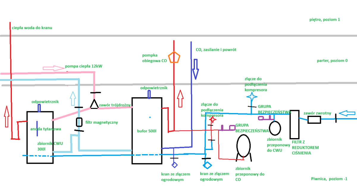 Piwnicę planuję pogłębić o 30cm, położyć folię i wylać posadzkę i na to płytki. Na ścianie gdzie będą rury i zbiorniki planuję dać styropian grafitowy 10cm. Zbiorniki oraz rury dodatkowo obudować styropianem grafitowym 10cm, rury w otulinie kauczukowej. Rury między pompą a zbiornikami - miedź 35mm. - będą szły przez pokój przy ścianie.