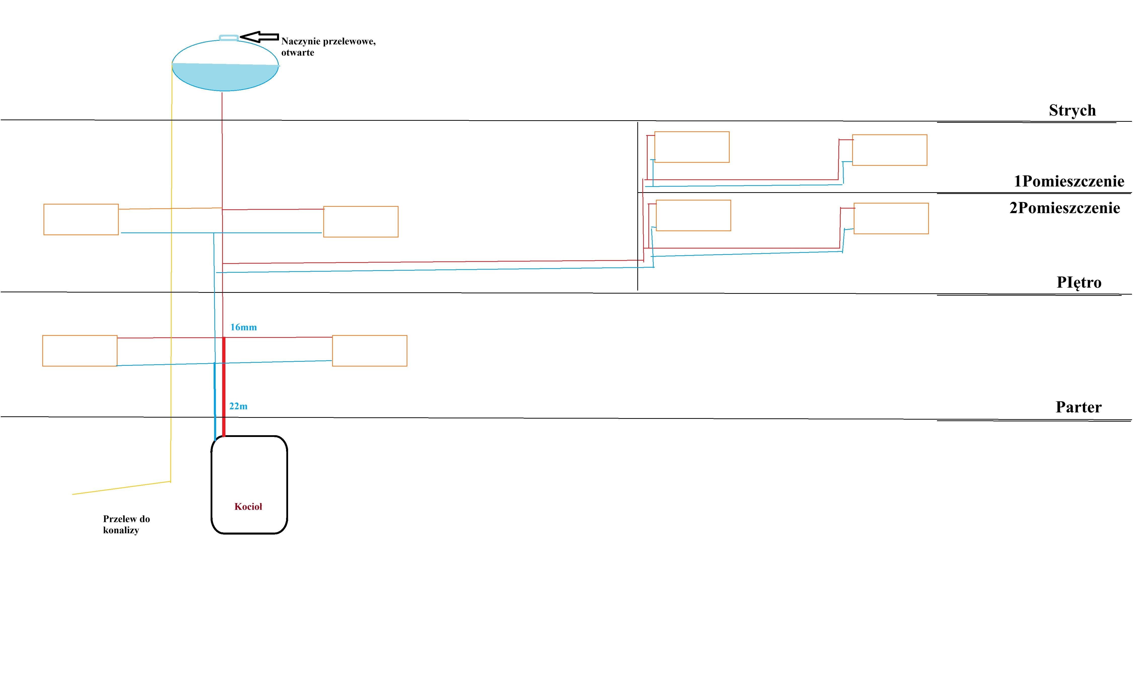 1. Witajcie. Mieszkam w domu jednorodzinnym, w którym ponad 10lat temu została zrobiona instalacja c.o. Była robiona przez firmę, ale jak się okazuje zrobiła ona masę błędów. Dwa pokoje które są najdalej od kotła( 4 grzejniki 60cm) , na piętrze, od zawsze są zimniejszy niż te bliżej kotła. Jestem prawie pewien ze jest to wina zbyt małych rur pionu, który już na parterze rura z piwnicy 22 przechodzi w 16mm w miedzi. Próbowałem chyba już wszystkiego, wymiany pompki na większą, kryzowania, różne typy podłączeń grzejników, mniejsze/ większe grzejniki, wszystko na marne, w końcu nie da się w ten sposób powiększyć rur. I tu nasuwa się moje pytanie. W piwnicy z armatury wychodzą wspomniane rury 22mm- zasilanie oraz powrót na grzejniki. Czy wpinając się bezpośrednio w te rury( trójniki) i ciągnąc aż do ostatniego pokoju jestem w stanie zrobić tak, żeby grzejniki na piętrze były cieplejsze niz do tej pory? Powstaje wówczas "drugi " pion, który jest połączony z pierwszym już w piwnicy, ale leci bezpośrednio z pieca do 4 grzejnikow w najdalszych pomieszczeniach i nie ma swojej pompki tylko wspólną (Circula, model 25/6 180). Funkcjonujący układ c.o. to uklad otwarty, do naczynia wyrownawczego na strychu leci rura, która nie idzie bezpośrednio z kotła, tylko z wspomnianego pionu, ktory zasilania grzejniki, od najwyższego grzejnika jest nad nim ok 1metra. Grzebiąc po forach i po roznych schematach, sądzę ze rura która dostarcza wodę do naczynia powinna isc bezpośrednio z kotla, ale tak jest i niestety nie moge tego zmienić. Jedynie Rura przelewowa jest osobna i leci bezposrednio do piwnicy, do kanalizy( w momencie gdy pali sie co jakis czas drzewem w tzw trybie awaryjnym i nie przypilnuje sie pieca, to tą rurą ucieka powietrze z wodą, czyli poprawnie). Analizując sytuację i pomysł z drugim pionem myślę, że trzeba do tego nowego poionu również dołożyc dodatkowe naczynie na strychu na tym samym poziomie co pierwsze, aby uniknąć zapowietrzenia lub różnicy ciśnień. Zacząłem nawet to robic i rury mam juz doprowadzone przy najdalszym pomieszczeniu na piętrze, zostało mi dołożenie ewentualnego naczynia. Przed pracą pomysł przedstawiłem hydraulikowi, który twierdzi, ze to będzie działać i pompka da rady, nie będzie żadnej kolizji z przepychaniem wody. Ale prowadząc rury dużo myślałem i zacząłem grzebać w internecie i widzę, po przypadkach ludzi, ze nawet osoby z uprawnieniami potrafią walnąć gafę w instalacji, dlatego chcialbym skonsultowac z madrzejszymi i bardziej doświadczonymi ludzmi tu, na forum. Czy jest to dobry pomysł który będzie działał bezpiecznie? Czy coś dołożyć? Jakiś odpowietrznik? To, czy będzie wystarczająco grzało, to najmniejszy priorytet, najważniejsze, czy układ nie będzie tykającą bombą? Oczywiście ostatnie 4 grzejniki odłączę od starej instalacji i włączę w nowa. Schemat aktualnego systemu oraz zamysłu nowego załączam w załącznikach. UWAGA, na załączniku po lewej stronie narysowane są 4 grzejniki, w rzeczywistości jest ich 6, po trzy 60cm i 80cm. Sytuacja z prawej strony jest taka jak w rzeczywistości, czyli 4x 60 cm. Uprzedzając pytanie, nie jestem w stanie wymienić glownego pionu ze względu na brak zgody pozostałych domowników, którzy są właścicielam domu, jedynie poprowadzenie innymi pomieszczeniami wchodzi w grę i na to mam zgodę. Proszę również o wyrozumialosc, mam świadomość, ze poprawnosc instalacji zostawia wiele do myslenia. Ktos to kiedys zle zrobil, a ja chce spróbować to poprawic. Grzejniki najzwyklejsze stalowe. Kocioł na ekogroszek- REFLEX ASTRA 30. Moc nominalna 30kw, zakres mocy 9-30kw, max pobor mocy 284w. (Dziala i grzeje doskonale, pokoje blizej kotla, przy ustawianej "7" na zaworze 4d maja naprawde gorąco, ale najdalsze, przez rury, juz maja tylko cieplo.) Zawór 4d afiso dn25 Układ otwarty z naczyniem wyrównawczym na strychu, naczynie metr nad ostatnim grzejnikiem. Pompa obiegowa marki Circula, model 25/6 180 Pozdrawiam.