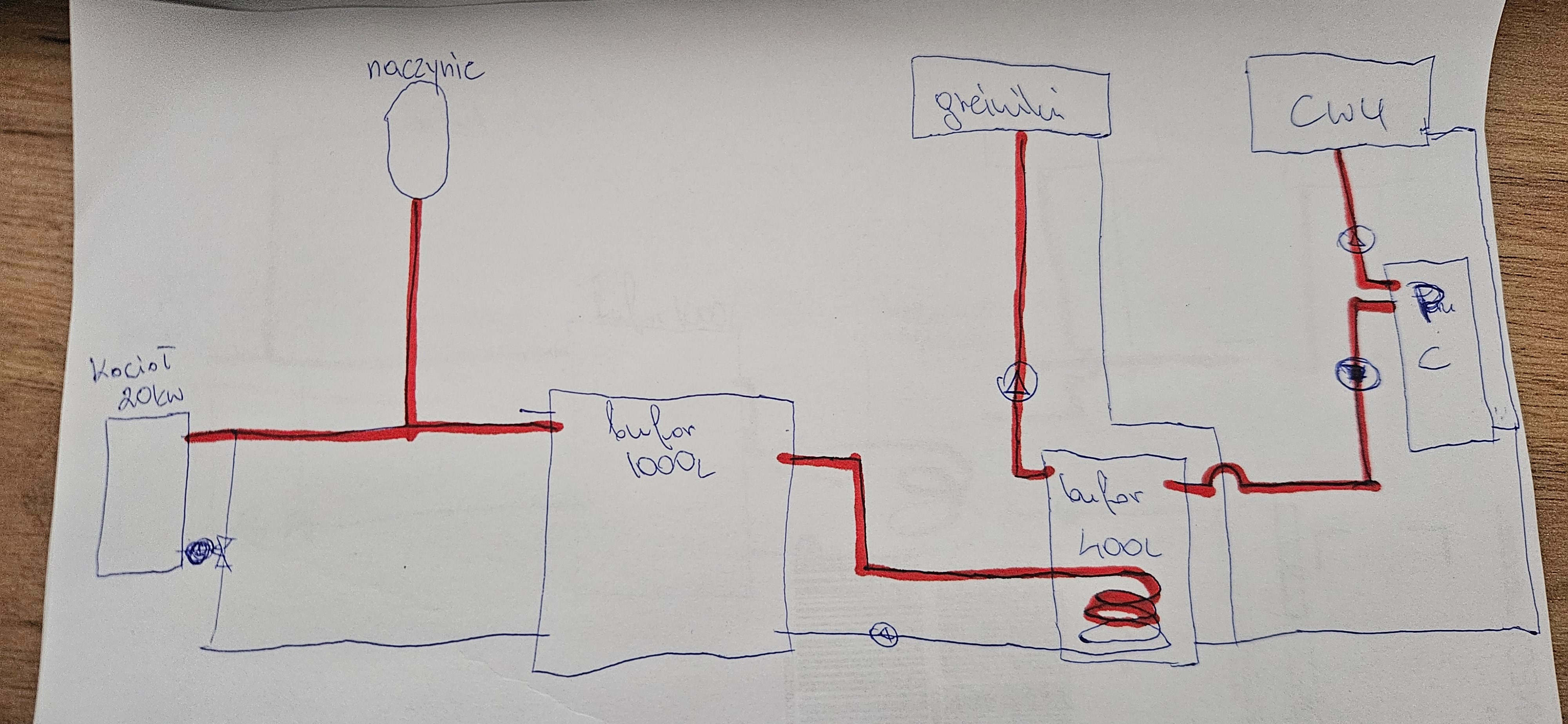 Chciał bym dołożyć piec na drewno do istniejącej instalacji PC monoblock . kocioł na obiegu otwartym z buforem 1000l. Czy mógł by mi ktoś powiedzieć czy ten schemat będzie OK? i czy będzie podgrzewał bufor 400l od instalacji PC. Z góry dziękuje za wszystkie podpowiedzi.