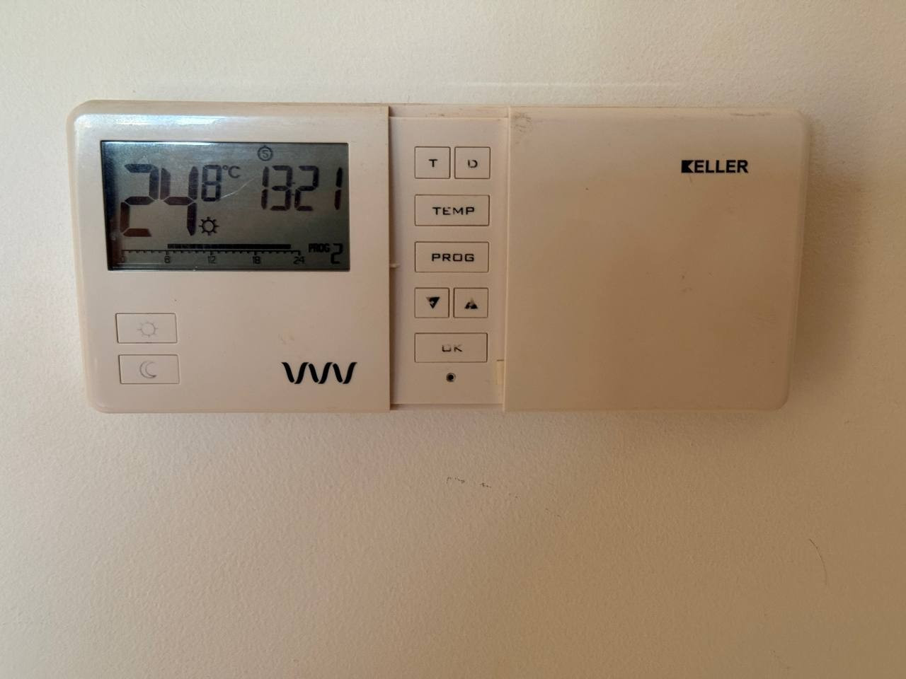 Od pewnego czasu, prawdopodobnie po wymianie baterii w sterowniku, zaczęły się problemy z ogrzewaniem. Najpierw piec w ogóle nie grzał kaloryferów, co latem nie było żadnym kłopotem, ale jesienią sytuacja zrobiła się uciążliwa. Po różnych próbach udało się ponownie uruchomić ogrzewanie, jednak zauważyłem, że piec nie utrzymuje temperatury ustawionej na sterowniku. Zamiast tego trzyma minimalną temperaturę ustawioną na głowicy kaloryfera, czyli 40°C (niżej nie da się ustawić).