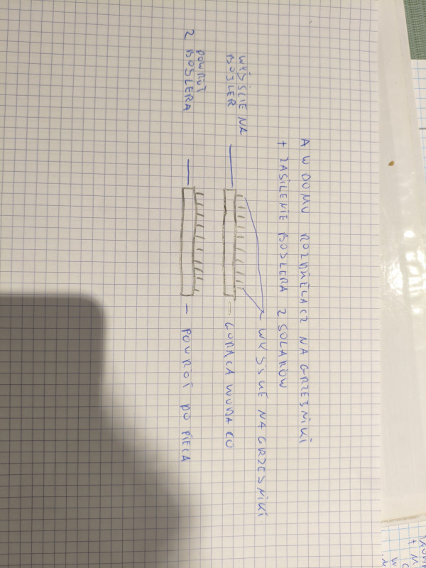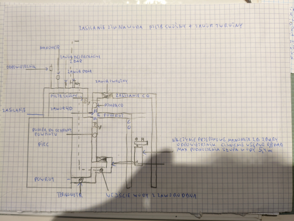 Witam, zacznę od początku. Pół roku temu postanowiłem zmienić piec z kopciucha zamontowanego w domu na peletowy umiejscowiony w pobliskim budynku. W związku z tym że posiadam pompy ciepła powietrze -powietrze i kominek z dystrybucją gorącego powietrza nie spieszyłem się z wymianą. Jesienią poprowadziłem instalację z nowej kotłowni do domu. Kilka dni temu zacząłem podłączać piec z całym osprzętem i stąd moje pytania. Pyt 1 Czy instalacja jest zrobiona poprawnie(pompa ochrony powrotu do obrócenia korpus ,zamocowanie naczynia przeponowego zdjęte w celu zmiany ciśnienia występnego. Pyt 2 Za namową speca który stwierdził że jeżeli mam kolektory słoneczne to mogę CO i CWU puścić na jednej nitce tak też uczyniłem.W domu zamontowałem rozdzielacz na grzejniki 1 cal z niego wychodzą zawory PEX 16mm i przelot do bojlera z dwoma węzownicami. Odpowietrznik będzie na rozdzielaczu czy powinienem dać jeszcze jeden zawór bezpieczeństwa przy zasileniu bojlera. Piec będzie pracował w układzie zamkniętym.