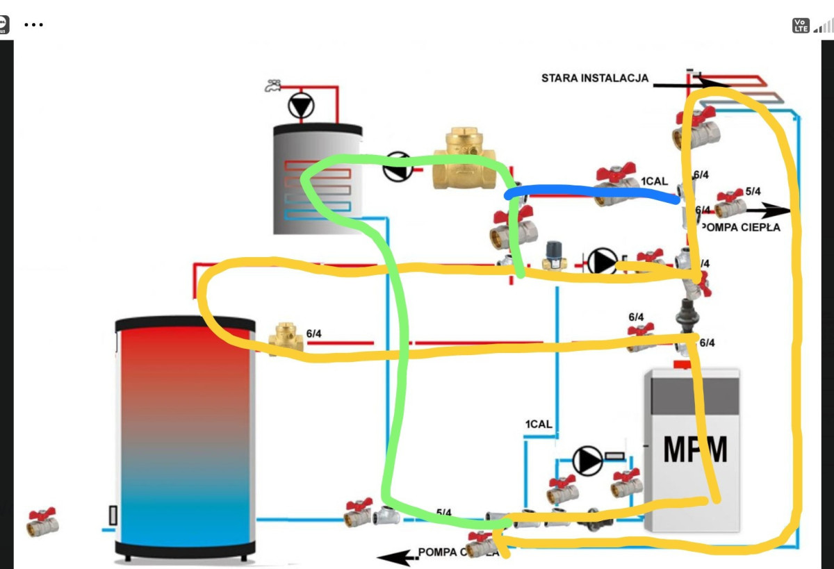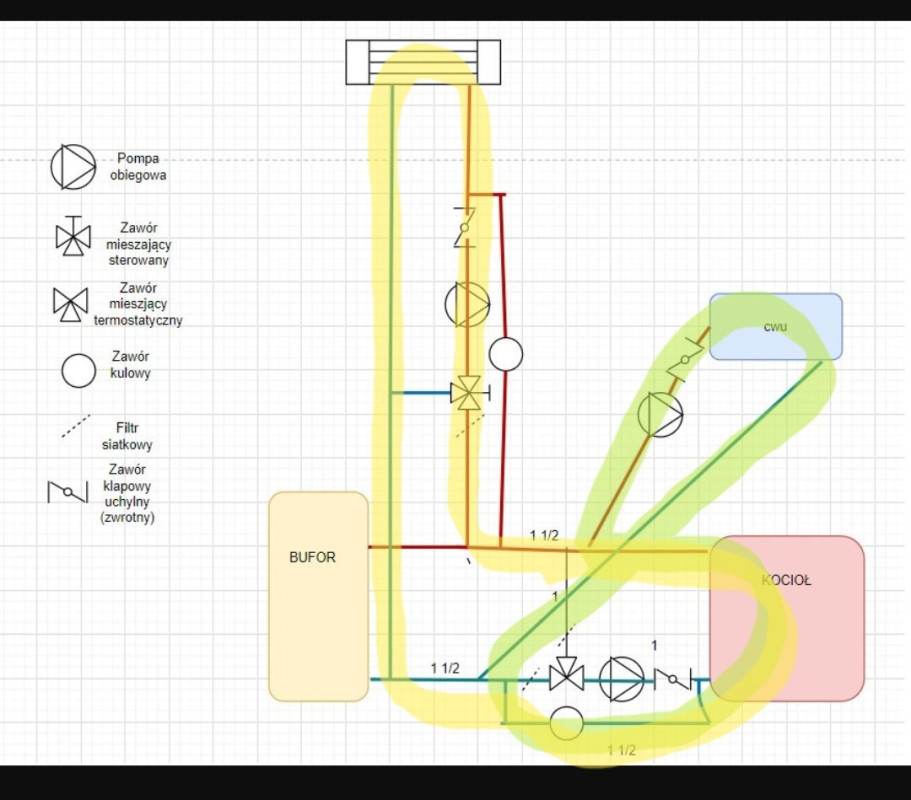 1. Dzień dobry, przeanalizowałem ten temat i nie mogę znaleźć odpowiedzi na nurtujące mnie pytanie czy w przedstawionym jako pierwszy i ostatni schemat z postu #78 po wygaszeniu kotla i wyłączeniu pompki kotłowej i nadal pracujących pompkach CO i CWU obieg (zaznaczony na żółto i zielono) nie będzie krążył przez kocioł zamiast przez bufor?