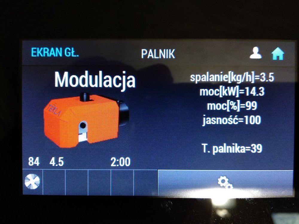 Mam pytanie odnośnie modulacji kotła. Mam obecnie ustawiony kocioł na pracę manualną-czasową (kocioł pracuje od godz. 9:00 do 21:00). Temperatura zadana na kocioł to 60C. Po nocnym wychłodzeniu kotła wydaje mi się że przy załączeniu o godz. 9:00 powinien on zacząć pracować z mocą maksymalną czyli coś około 24kW (żeby szybciej nagrzać wodę w kotle). Tymczasem w sterowniku w menu palnik wyświetla się to: -