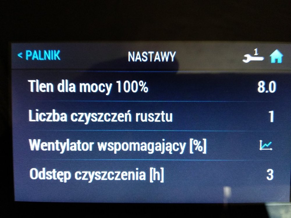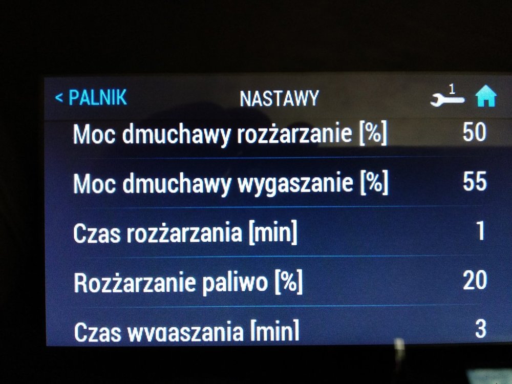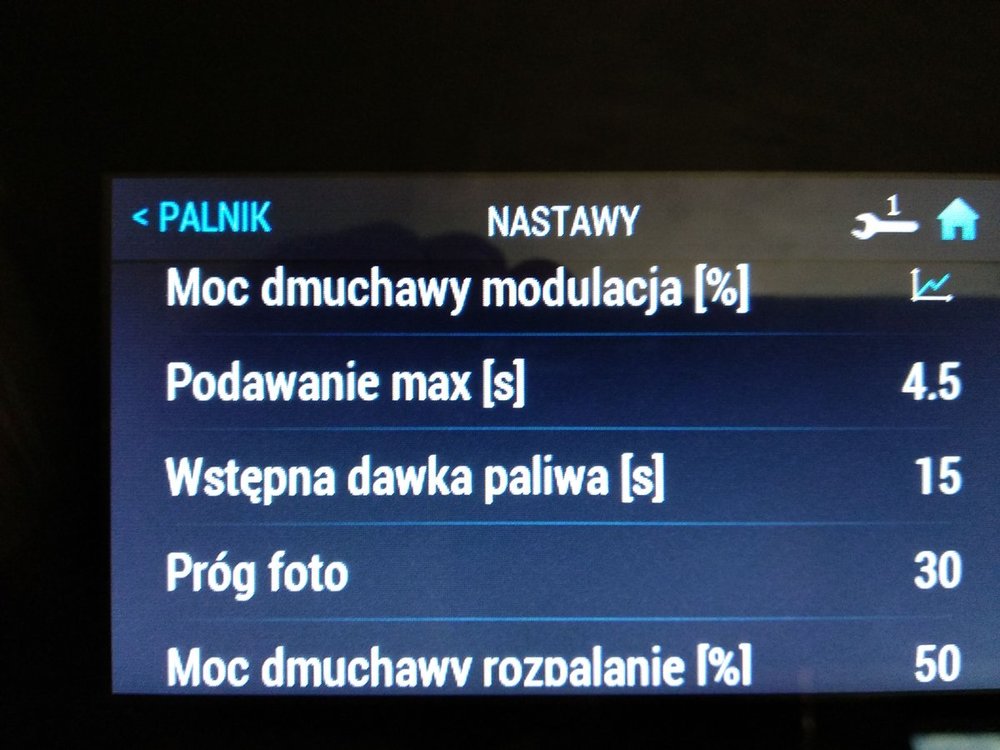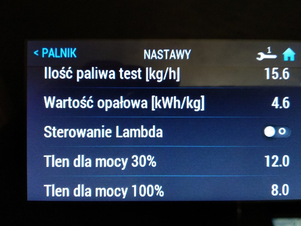 Wpisałem to co jest podane na worku producenta pelletu (Lava) czyli 4.6kW natomaist wydajność wpisałem taką jaka wyszła mi po zważeniu pelletu. Ogólnie w menu palnik mam takie ustawienia: Czyli pewnie coś z ważeniem pelletu schrzaniłem, mimo to że dwa razy ważyłem i wychodziło mi 15,6kg/h. -