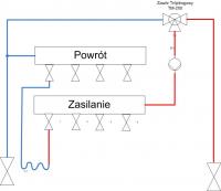 Witam ekspertów, mam następujace zapytanie. Podłaczałem podłogówkę do istniejacej instalacji CO. W zwiazku z tym, że miałem już rury wodne z zasilaniem po prawej oraz powrót po lewej stronie oraz na stanie zawór trojdrogowy oraz chcialem zamontować pompę energooszczedną grunfos Alpha zdecydowałem się na samodzielny montaż. Mam tylko jeden problem. po podgrzaniu podłogowki na powrocie zacznie płynąć goraca woda zatem co z tego że zawór mam ustawiony na 35 stopni skoro z lewej strony bedzie naplywała gorąca z powrotu. Jak zmianić ten obwód aby podłogówka pracowała w obiegu zamknietym przy temperaturze 35 stopni a jak spadnie temperatura to aby dopusciła goracej wody z zasilania co - ok 55 st C Prosze o podpowiedzi. Jak zrobić to najprosciej i najtaniej? w zalaczniku zdjęcie i schemat podłogówki Z powazaniem Paweł