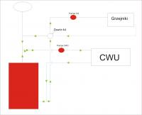 2. Witam! Od pewnego czasu czytuję forum, ale nie znalazłem informacji dotyczących moich problemów. Moja instalacja składa sie z kotła Stalmark 25 KW, zawór 4d ESBE 1,5", dwie pompy: Grundfos alpha pro 25-60 do CO i grundfos UPS 25-40 do CWU. Problem pierwszy to bulgotanie w kotle - po osiągnięciu zadanej temperatury ( w tej chwili 62 st.C) w kotle słychać odgłosy "bulgotania" i zaraz potem słychać powietrze przechodzące przez pompy. Drugi problem to niewłaściwy obieg wody: jeżeli zawór 4d jest ustawiony na mniej, niż ok 3/4 wody ciepłej, do zaworu płynie woda z powrotu CWU i część z niej idzie na grzejniki, a reszta wraca rurą "zasilającą" z kotła i wraca do obiegu CWU. Zamieszczam zdjęcia - może one pomogą zrozumieć to, co napisałem. Z góry dziękuję za pomoc Pozdrawiam