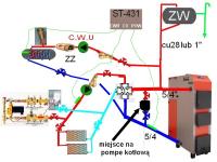 Witam jestem po rozmowie z instalatorem który robił mi instalację, twierdzi że temperatura powrotu do kotła 30 stopni wiele nie szkodzi dla żywotności kotła, bo pale suchym miałem i na piecu mam 60-70 stopni i jak woda z powrotu wraca do kotła i zmiesza się z tą w kotle to i tak jest wysoka wiec korozja nie grozi, jeżeli chodzi o oszczędności związane podniesieniem temperatury powrotu to po zmianch byłyby bardzo niewielkie i nie adekwatne do kosztów przeróbek. Ale jeżeli chce to żaden problem i mi to przerobi, uważa jednak że na grawitacji to raczej niema szans żeby to pracowało bo to dom parterowy i wszystko na jednym poziomie także tylko i wyłącznie dodatkowa pompka. Jeżeli chodzi o CWU to mówi że raczej niemożliwe żeby woda się cofała (pomimo braku zawrotu zwrotnego) do kotła bo rury idą w dół w podłogę, a pompa raczej nie przepuści. Jeśli chce przerobienia to on proponuje dwa rozwiązania: 1. Pompa na powrocie do kotła zaraz przy wejściu do pieca 2. Takie jak Guitar proponuje, tzn. wpięcie w zasilanie (przed zaworem 4d) i wpięcie w powrót zaraz przy wejściu do pieca Oczywiście ja nie wstawiłem zaworów zwrotnych, odcinających itp. zrobiłem tylko rysunek poglądowy gdzie mogłaby być pompa Co o tym wszystkim sądzicie ??