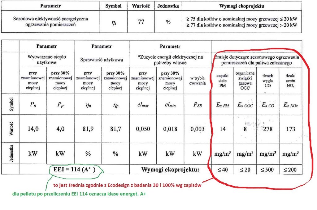Ecodesign jest średnią z badania mocy 30% oraz 100%, bierze się %wyniku z badania 100%mocy i %wyniku z badania 30% i podaje się średnią plus emisja NOx i wskaźnik EEI. W Ecodesign nie ma mowy o mocy znamionowej i zredukowanej. Moc znamionowa i zredukowana dotyczy 5klasy i badania wg PN-EN 303-5:2012 Tu wskaźnik EEI dla pelletu powinien byc duzy wyższy jak to 78% To oznacza klase energetyczna C i na żadne dotacje nie powinno się łapać. Klase C to mają słabsze kotły na ekogroszek z retortami klasycznymi Chyba, że to nie jest podane na tym tłumaczeniu a podane jest co innego. Na Ecodesign musi być EEI (oprócz samej sezonowej efektywności energetycznej) W każdym razie to z tych tabel to 5klasa wg pn-en 303-5:2012 z dodatkowymi emisjami NOx ale to nie sa dokumenty Ekoprojektu ani Ecodesign. Tam jest tylko literalnie napisane,że spełnia Ecodesign bez przedstawienia emisji to dokumentujących. Kto się zgodził na podstawie takiego czegoś dawać dotacje???? 75<EEI<82 = klasa energetyczna C 82<EEI<90 = klasa energetyczna B 90<EEI<98 = klasa energetyczna A 98<EEI<125 = klasa energetyczna A+ i tylko minimum taka jest dotowana w nowym czystym powietrzu