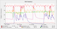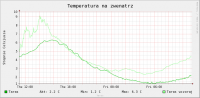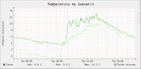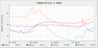 Witam Ok, postaram się krótko opisać budowę i funkcjonalność. Zmontowanie całości wymagało nieco samozaparcia i wiedzy informatycznej. Jednak od początku: Jak już pisałem - dom 120 metrów powierzchni mieszkalnej plus 70 metrów piwnicy. Dostęp do Internetu przez łącze ADSL bez linii telefonicznej (istotne w dalszych rozważaniach). Dom kupiony rok temu, połowa domu gruntownie remontowana (łącznie z wymianą rur w ścianach, więc była okazja, żeby położyć kable do części pomieszczeń). Sercem systemu jest router TP-link TP1043 z wymienionym oprogramowaniem na OpenWrt (właściwie dystrybucja Linuksa, ale bez strachu) - koszt 180 zł. Do routera jest podłączony przez USB dysk 750GB, na którym przechowywane są programy, różne media, na ten dysk router też ściąga zadane pliki z Internetu. Koszt dysku koło 250 zł. Do tego modem ADSL do łączenia z Internetem - 50 zł, modem 3G do awaryjnego łączenia z Internetem - 100 zł (oczywiście z tego drugiego można zrezygnować). Od szafki z routerem w piwnicy poprowadzona jest skrętka w różne miejsca domu - zwykle 2-3 kable do pomieszczenia (ale tylko do tych, które były remontowane), plus jeden kabel idący na zewnątrz domu - koszt kabli koło 150 zł. Mamy więc około 750 zł za całość infrastruktury dostarczającej niezawodnie Internet do domu dla przeróżnych urządzeń - laptopów, telefonów, odtwarzaczy mulitimedialnych, itp. Plusem jest dysk dostępny z każdego urządzenia - choć przyznaje nie jest to mało jak na same te zastosowania. Teraz przejdziemy do sedna - router posiada podłączoną przejściókę do magistrali 1-wire (koło 50 zł), a przez wcześniej opisane okablowanie rozprowadzonych jest po domu i na zewnątrz 14 termometrów (jeden termometr ds1820 koło 3 zł u sensownego sprzedawcy) Pozwala to monitorować: - temperaturę w 7 pomieszczeniach - temperaturę na zewnątrz - komplet temperatur z kotłowni (przy piecu na ekogroszek i instalacji z zaworem 4d - zasilanie, powroty, woda na grzejnik, woda idąca do instalacji cwu - świetnie widać np. kiedy w domu używana jest ciepła woda i kiedy warto włączać cyrkulację) Dane wysyłane są na serwer przez internet i pozwalają z dowolnego miejsca obserwować wykresy w temperatur. Pomiary temperatur wykonywane są co minutę i zwsze można sprawdzić aktualną temperaturę. Do tego dane są zbierane, system wyciąga średnie, maksymalne, rysuje wykresy, itp. Ponieważ mam komplet danych, to router robi też prostą analizę i wysyła powiadomienia gdy temperatury są podejrzanie niske lub wysokie. Wykrywa też kiedy piec wygasa (skończył się opał, zerwała się zawleczka) - na podstawie spadającej temperatury wody na kotle, a zimą dodatkowo (żeby szybciej reagować) na podstawie spadającej temperatury wody idącej na grzejniki (zima jest umowna, ale system po temperaturze zewnętrznej wie czy grzejniki powinny być ciepłe czy nie). Przykłady wykresów załączam do posta (poniżej wykres dla kotłowni), na końcu więcej przykładów. Co jeszcze system potrafi? Mam też drugi router (dLink DIR-320, 180 zł), także z OpenWrt. Początkowo służył jako bezprzewodowy printserver do drukarki, która stoi w pokoju, w którym nie ma kabla do internetu. Teraz dodatkowo podłączona jest do niego przez usb prosta kamerka internetowa (50 zł) skierowana za okno (obejmuje widokiem cały zewnętrzny płot i miejsce gdzie stawiamy samochody). Router monitoruje tę kamerkę i po wykryciu ruchu robi zdjęcia i od razu wysyła je na serwer przez Internet (jak mi by ktoś wyniósł zawartość domu łącznie z urządzeniami do rejestracji, to i tak zdjęcia są bezpieczne). Router z dyskiem i kabel poprowadzony do salonu przydaje się jeszcze do czegoś. Kupiłem urządzenie multimedialne (WD TV Live), które połączone jest z routerem przez kabel. Dzięki temu w piwnicy mogę trzymać archiwum rodzinnych filmów, muzyki, zdjęć, itp. i mogę je odtwarzać na telewizorze w salonie, słuchać radia internetowego na wieży. Na dysk podpięty do routera mogę ściągnąć film przez Internet i obejrzeć go bez nagrywania na płyty czy noszenia dysków. Duża wygoda, tym bardziej, że każde inne urządzenie sieciowe w domu ma także dostęp do tych samych danych. Co jeszcze chcę zrobić? Kupić serwonik (coś takiego http://www.nestor-electronic.pl/strona.php?sterowniki) podłączany przez ethernet (koło 250 zł, tak, do kotłowni też mam pociągnięte kable od routera) i sterować nim w sposób inteligentniejszy cyrkulacją cwu (zależnie od obecności w domu, być może nawet w powiązaniu z google calendar, nie uruchamiać cyrkulacji, gdy ktoś chwilę wcześniej odkręcał gorącą wodę, bo i tak jest jeszcze ciepła w rurach). Analogicznie przez wejście sterownika pieca na termostat pokojowy sterować temperaturą (mam zawór 4d i na sterowniku ustawiam ile % ma być obniżona temperatura wody w co po sygnale od sterownika). Pozwoli to np. obniżyć temperaturę gdy będę wyjeżdżał i przywrócić ogrzewanie przez Internet lub zgodnie z harmonogramem. Chcę także, żeby sterownik zliczał uruchomienia podajnika ślimakowego - żeby szacować ile jest jeszcze ekogroszku w podajniku i zliczać spalanie przy różnych ustawieniach i warunkach zewnętrznych. Możliwości jest jeszcze więcej. Np. podlewanie ogródka. Tradycyjne systemy podlewają kiedy w ostatnim czasie nie padało. Mając przez net dostęp do dokładniej i sprawdzalnej prognozy numerycznej dla mojej okolicy (icm taką oferuje, prognoza na kilka godzin bardzo dobrze się sprawdza), mogę uruchomić podlewanie jeżeli nie padało i w ciągu najbliższego czasu nie będzie padać. Można sterować światłem, sprawdzać poziom wody w kratkach, itp. Pomysłów jest dużo. Kwestia tylko czasu na realizację i samozaparcia (bo nie każdy ma takie hobby i nie każdy lubi dłubać w takich systemach). Przy znajomości pewnych technik wszystko buduje się jak