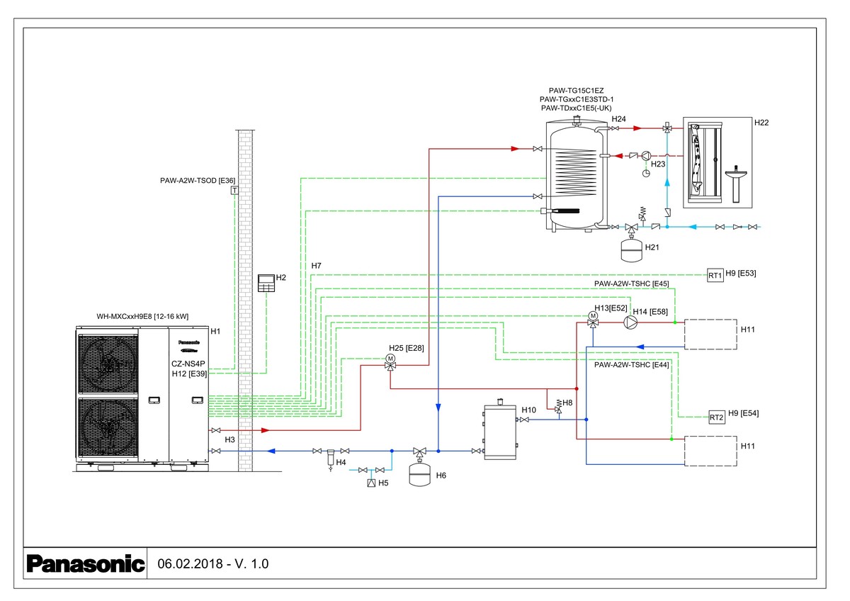 Modernizacja instalacji grzewczej Przeniesienie bufora na powrótsambor odpowiedział(a) na Tedisan temat w Pompy ciepła Nie ważne jak podłączysz, ale zawsze pompa z jednej strony - ta np od PC musi mieć większy wydatek od sumy wydatków wszystkich pomp pracujących na odbiorach. Inaczej całość idzie się j...ć, szczególnie jak ktoś napcha zaw zwrotnych nie tam gdzie trzeba. Bez problemu można zrobić 2 lub wiecej obiegów z buforem na powrocie, sam robiłem taki układ ( 3 obiegów ) na sterownikach niezależnych dla PC skośnookiej 16kW. Poniżej Panasonic - 2 obiegi , bufor na powrocie, tu najważniejszy jest wihajsterek oznaczony na schemacie H8, bez tego ni cholery nie działa prawidłowo.