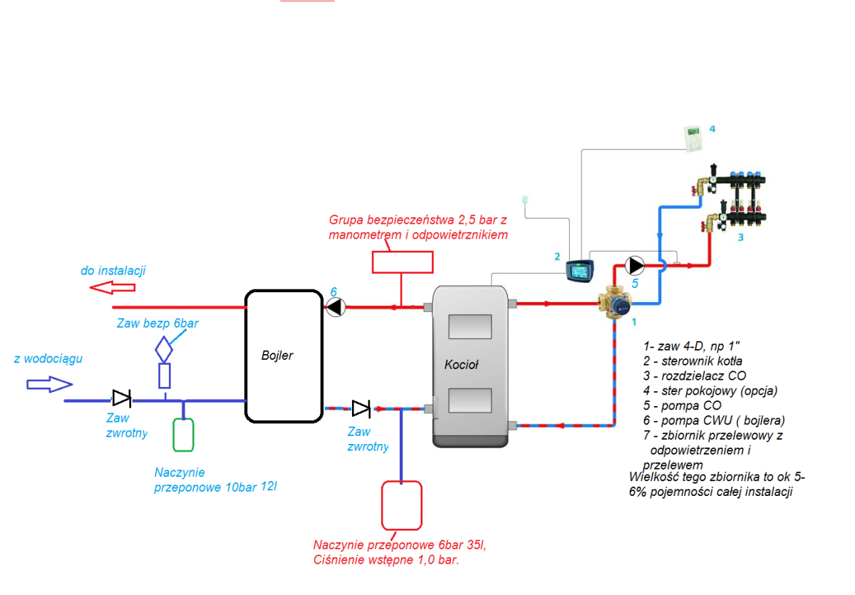 Jesteś leń , jest tego od groma w necie np https://allegro.pl/oferta/naczynie-przeponowe-wzbiorcze-wyrownawcze-c-o-35l-membrana-zbiornik-opaska-14693482924?bi_s=ads&bi_m=productlisting:desktop:query&bi_c=YWQ3ZTcxYjMtOTdmOS00ODU1LThiODctMTE3OGEwYzcyY2MyAA&bi_t=ape&referrer=proxy&emission_unit_id=0cfb86ad-a462-4537-b827-6602fe3b105d to naczynie ma ciśnienie wstępne 1,5bar, spuszczasz ciśnienie do 1 bara i masz. do wody zimnej (bojlera) https://allegro.pl/oferta/naczynie-przeponowe-12-l-cwu-co-wzbiorcze-opaska-14136169968?bi_s=ads&bi_m=productlisting:desktop:query&bi_c=MDI1NDg5N2EtODhkZi00MDc4LWE2MjctMzUwYjgzZjIyY2RkAA&bi_t=ape&referrer=proxy&emission_unit_id=fcc1737c-1103-410f-a8a5-5de861919c37 Grupa bezpieczeństwa: https://allegro.pl/oferta/grupa-bezpieczenstwa-co-zaworem-bezpieczenstwa-2-5-bar-dlugosc-280-mm-ma-16375419493 Może się lepiej za to nie bierz, gdyż nie masz pojęcia co i jak w tym temacie i może wyjść problem i to spory!