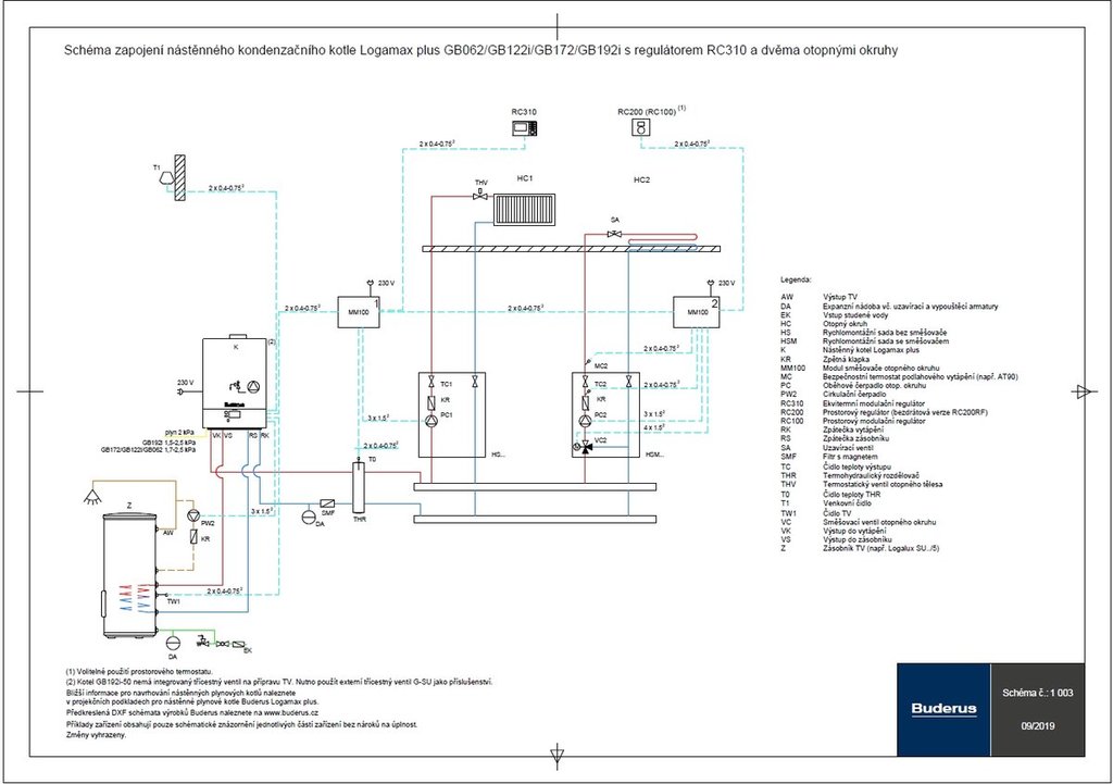 Kocioł ma na pewno sterowanie czujnikiem temperatury zewn! Poniżej schemat jak powinien być wykonany układ hydrauliczny - przepraszam że po czesku, ale polski buderus oficjalnie nic nie ma na temat tego kotła, więc jak mają go podłączać. Na rysunku są podane nawet kable co i jak ma być połączone. Moduł RC310 jest nowszą wersją RC300, i może być stosowany zamiennie. Na schemacie są grzejniki i podłogówka, ale druga podłoga zamiast grzejników to nie problem Jak widać czujnik pogodowy jest i ma się dobrze