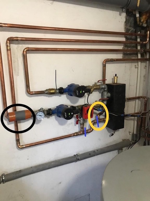 To między trójnikiem powrotu grzejników ( to żółte kółko co zaznaczyłeś ) a wpięciem zaw 3-D ( też trójnik na powrocie) - odcinek odcięty niebieskimi kreskami - trzeba dać zaw zwrotny.