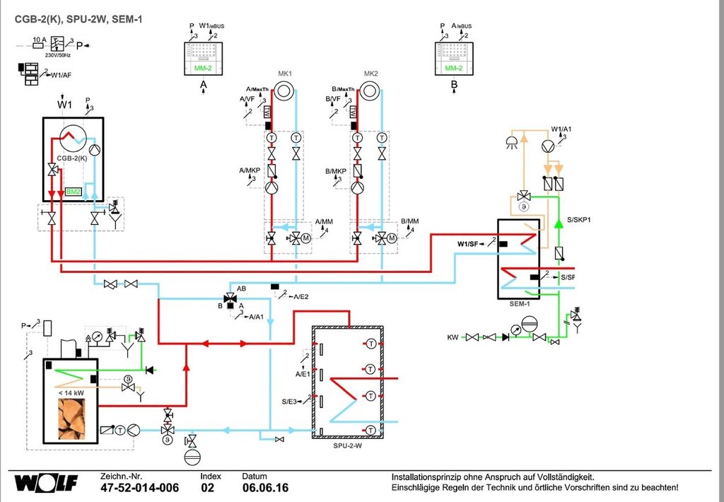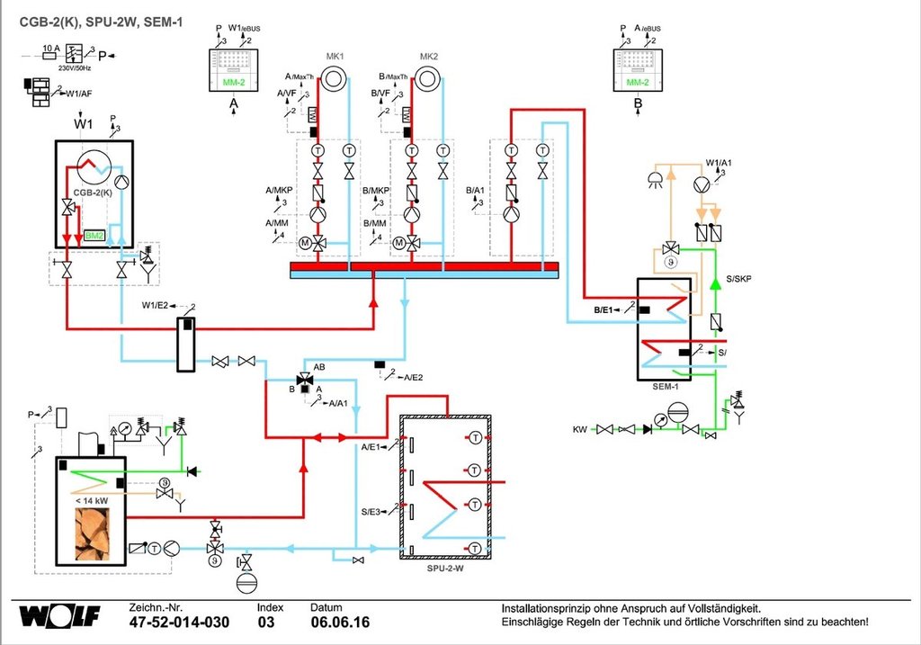 Ten schemat do niczego się nie nadaje. Popatrz jak to robią inni np Wolf: Na schematach jest jeszcze zaznaczona instalacja do solarów, której nie ma na rys. Aby ciś zrobić musisz określić co chcesz i co masz. PS Nie wszystkie elementy z twojego postu muszą być użyte, większości nie powinno być. Naczynie przeponowe do bufora będzie miało ponad 100l pojemności -