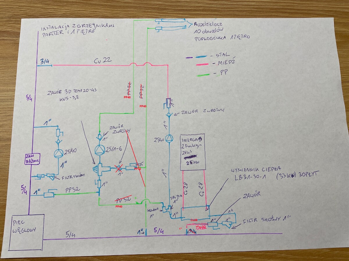 To wygląda jak instalacja całkowicie "składkowa" - montowana z tego co było pod ręką. Największy problem to za mały wymiennik - on stawia za duży opór i stąd są za małe przepływy w podłogówce, ponadto trzeba wymienić co się da z rur PP32 na PP40 , zmienić lokalizację zaw zwrotnego na powrocie podłogówki i inne drobne- zaznaczyłem to na rysunku. Jakby nadal było mało z przepływami , to trzeba zmienić za 3-D z Kvs 3,2 na Kvs 4,2-4,5 Ale najpierw wymiennik i rury. -