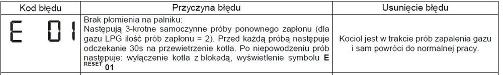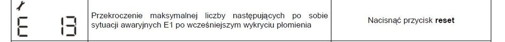 12. Masz chyba instrukcję w instrukcji jest podane to co poniżej. Najprawdopodobniej to albo brudna dysza, zaw gazowy w kotle, lub co innego na ścieżce gazowej np za niskie ciśnienie gazu. Sam tego nie ruszaj. Dodatkowo E1 to błąd kabli zasilających - sprawdź ciągłość kabli i ich podłączenie do kotła. Ale uwaga - to robisz po odłączeniu kotła od sieci!!!!