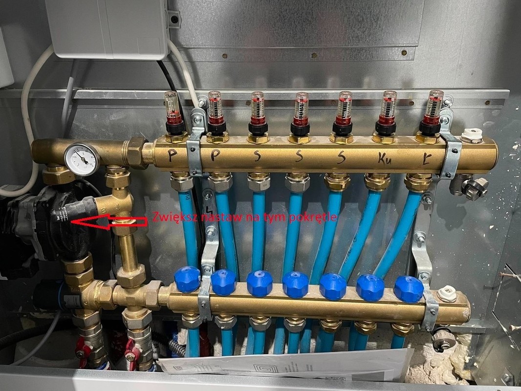 Małe wartości na rotametrze w ogrzewaniu podłogowym.sambor odpowiedział(a) na Łakomy temat w Instalacje CO i CWU Jaki masz zaw 3-D - ten na dolnej belce rozdzielacza Ponadto zwiększ ciśnienie dyspozycyjne pompy - podkręć to czarne pokrętło. Odkręć na max niebieskie pokrętła na dolnej belce