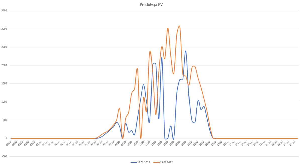 17. Ja tak na szybko w temacie wyłączania (lub wyłączania się) inwerterów. Jak pisałem w mojej gminie dotacja i ma powstać 673 instalacje fotowoltaiczne. Nie wiem ile do dziś działa - na pewno z 5 na mojej ulicy (20 domów). Dziś pierwszy tak naprawdę słoneczny dzień (zero chmur) a produkcja wygląda tak: Instalacja 4,8kWp. Inwerter co chwila wyłączony. Napięcie na jednej z faz 260V. Na pozostałych 250 i 220. Także tak to wygląda jeżeli chodzi o fotowoltaikę u mnie. A to dopiero luty. Człowiek od Tauronu jak wymieniał licznik na dwukierunkowy to trochę wyśmiewał ten projekt. Cóż - niby człowiek wiedział, ale jednak się łudził, że może nie będzie aż takich problemów. Pytanie czy komuś będzie zależało na tym, żeby sytuację poprawić.