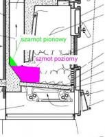 Nie mierzyłem szamotów robiłem to na oko, środkowy szamot "trzyma" się na metalowym kwadracie taki jak jest w zamku do klamki, ok 1cm x 1cm przekroju i jego długości to ok. szerokość szamotu, przyspawałem ten kwadrat do skosu, dosłownie dwa "smarknięcia" elektrodą. Szamot ma nacięcie które nachodzi na ten kwadrat, szamoty po bokach lezące na skosie "wiszą" na bocznych cegłach które leżą na ruszcie. Szamoty na skosie w dolnej części nie dotykają do rusztu i przy rusztowaniu nie ma żadnych problemów że coś się przesunie. Poprzednio jak miałem jeszcze wycinane w szamocie "zęby" to dość szybko się kruszyły i też cegły się przesuwały Poniżej rysunki żeby to jako tako zobrazować: