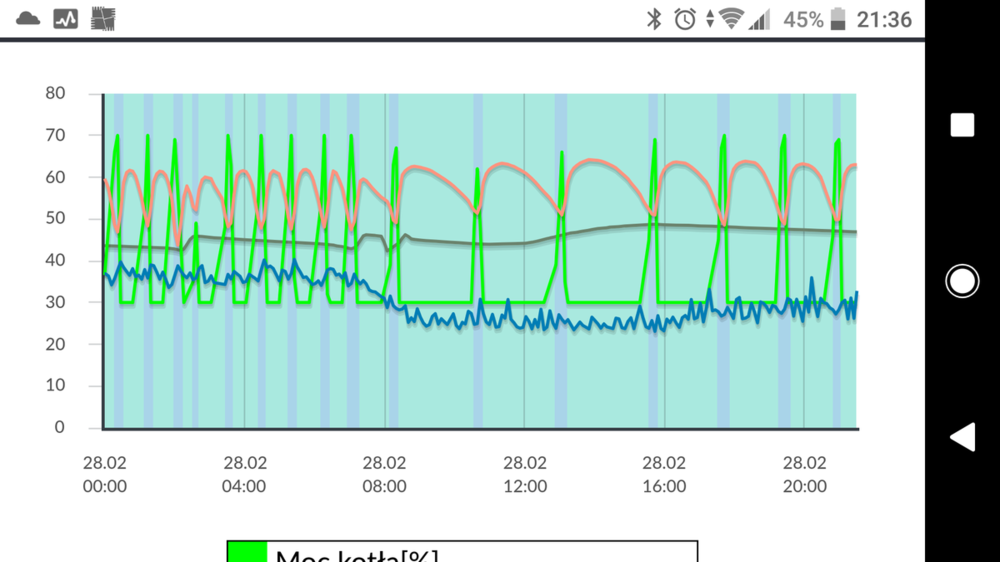 Witam ja podobnie jak @peha mam parametry fabryczne. Wykres jest zafalszowany bo od 12 do 16 solary grzaly CWU. Więc piec mniej pracował. Pozdrawiam Krzysiek