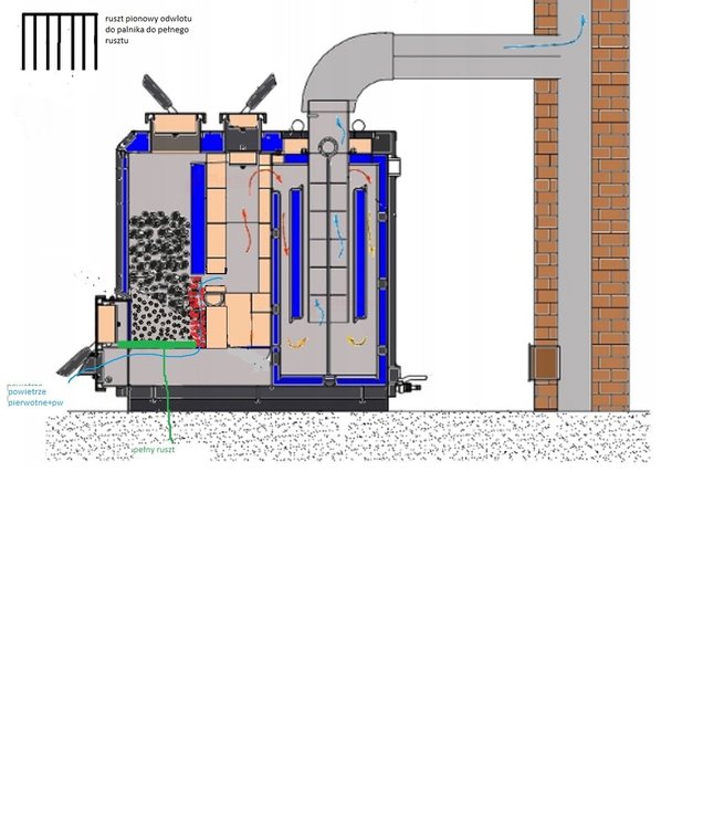 Carinus a może to powietrze ma być pierwotnym,a trochę podać pod ruszt,i na końcu tego kanału np.kątownik na całej szerokości coby było miejsce na mieszanie powietrza z destylatami i chroniłby przed zawaleniem ujścia do palnika.Tylko obawiam się że ten ruszt pod tym kanałem trochę za małe ma przestrzenie między zębami .To tylko moja sugestia
