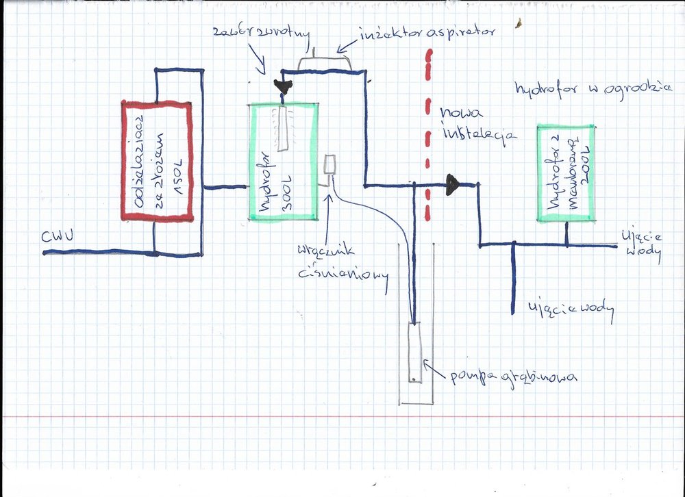 Witam Forumowiczów Mam problem nie mogę dać sobie rady z odpowiednim podłączeniem instalacji wody z studni głębinowej w tej chwili mam działająca instalację CWU . Pompa głębinowa w studni następnie jest inżektor zawór zwrotny i hydrofor 300 ocynkowany za hydroforem jest odżelaziacz wody na hydroforze zamontowany włącznik ciśnieniowy w tej chwili to działa . Ale z powodu częstego używania wody w ogrodzie do podlewania postanowiłem rozbudować instalację i w studni w trójnik z pompy wyprowadziłem rurę na ogród do drugiego hydrofora z przeponą 200 Litrów i teraz się głowie jak to ogryźć . gdzie włącznik ciśnieniowy zainstalować żeby sterował CWU w domu i w ogrodzie gdy odkręcę kran załączam szybki Rys instalacji I bardzo proszę o poradę i Pomoc Pozdrawiam -