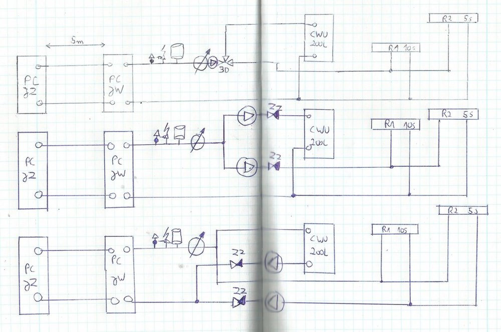 Panowie,czy ktoś coś doradzi ?Nie było odpowiedzi więc zamieszczę schemat. Krótka legenda : PC Jz - pompa ciepła jednostka zewnętrzna PC Jw - pompa ciepła jednostka wewnętrzna (wymiennik płytowy) R1 - rozdzielacz podłogówki na parterze 10 sekcji R2 - rozdzielacz podłogówki na piętrze 5 sekcji zz - zawory zwrotne Instalacja miała wyglądać jak na pierwszym schemacie.Zrezygnowałem jednak z zaworu przełączającego 3D kosztem 2 pomp obiegowych.Następnie plan był taki aby wykonać instalację jak na schemacie nr 2.Wszystko byłoby OK,gdyby nie to,że instalacja jest w piwnicy głębokiej na 2,8m. Problem stanowi umiejscowienie wymiennika płytowego,który muszę umieścić jak najwyżej,praktycznie pod samym sufitem aby był na jednym poziomie z jednostką zewnętrzną pompy.Wobec tego nie mam miejsca na pompy obiegowe na zasilaniu i postanowiłem je przenieść na powroty jak na schemacie 3.Czy ten schemat jest poprawny ?Czy zawory zwrotne za pompami na powrocie to dobre rozwiązanie czy dać je na zasilaniu ? -