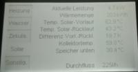 Proste doświadczenie : Bierzemy dwa pojemniki z wodą : 1 temperetura np. 20 st C, 2-gi np 80 st C. Wkładamy do zamrażarki i patrzymy która woda zamarznie pierwsza. Większość powie , że zminiejsza, a tak nie będzie..... Solvis wykorzystuje m.in to zjawisko, tylko w drugą stronę. Później umiejętnie wykorzystuje zgromadzoną energię. Co najważniejsze, bufor warstwowy potrafi utrzymać sprzyjające warunki do wykorzystywania tego rodzaju zjawisk, przez cały czas pracy całego ukł. grzewczego - i własnie to stanowi o jego skuteczności. P.S. Jeśli ktoś chce spróbować przestrzegam, aby użyć niewielkiej ilości wody, bo jak wsadzimy za dużo gorącej wody do małego zamrażalnika, to najpierw rozmrozi ona lód, a później skutecznie przymrozi drzwi do lodówki B) - Żona nie będzie zachwycona :) :( Takie zdjęcie znalazłem w telefonie: Tutaj jest zdjęcie z panelu, na którym można podglądać działanie systemu. Na dworze było 14,5 stopnia, dość słonecznie, ale nie bez chmurnie. Szkoda, że nie ma pomiaru natężenia promieniowania..... Po kolei: 1. Aktualna moc 2. Uzysk narastająco 3. Temperatura z kolektorów (płyn) 4. Temperatura do kolektorów (płyn) 5. różnica powrót- zasilanie 6. Temp. kolektora 7. Bufor - temperatura na dole - tam gdzie jest wymiennik 8. praca pompki solarnej To jest dla 10 mkw kolektora - absorber ma ok 9,6 mkw.... Wszystko jest zestrojone fabrycznie przez producenta, więc obraz powinien być prawdziwy - czy najbliższy rzeczywistości. Wychodzi ok 470W z mkw kolektora co by odpowiadało nasłonecznieniu ok 900 W/m2 i różnicy temp na kolektorze 50 stopni - co by się mniej więcej pokrywało z keymark dla tego kolektora. Dla podobnej powierzchni kolektor próżniowy Solvis'a LUNA według keymark miałby ok 3 kW - ale sam jestem ciekaw, jak wyglądałoby to w rzeczywistości. Ale prawdopodobnie, tak jak napisałem. Solvis produkuje, również kolektory próżniowe jednak ofertę, ale i tak rozwija cały czas kol.płaskie - więc coś w tym jest. Czas zwrotu. Myślę, że wszystko w swoim porządku. 45.000 zł netto to kompletny zestaw - który ma tą zaletę, że jest kompletny i ma jednego producenta, który sie pod nim podpisuje - jest też najbardziej wydajny. Mniejszy zestaw, który będzie pracował dobrze w domkach 100-140 mkw + 3 osoby można - ok 32.000 zł ( z zew kotłem gaz ) - dopłata NFOŚiGW - efektywnie ok 6.500 zł co daje 25.500 zł. Można zejść jeszcze z 2 -3 tysiące mniej stosując inne kolektory - innej firmy ( np. próżniowe ) Jeśli taki przykładowy domek zużywałby gazu za ok 3.500 zł zestaw zwróciłby się za ok 10-11 lat przy wzroście cen gazu 6% rocznie. P.S. Czy możecie mi polecić dobrą grupę wymiennikową do kolektorów słonecznych. Chciałbym mieć jakąś alternatywę do porównania. Cena Solvis'owskiej opartej na pompie Wilo Startos Para jest dość wysoka ... Pozdrawiam Paweł -