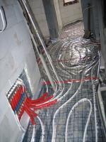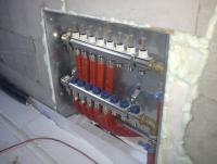 Schematu niestety nie mam. Podłoga grzeje wszędzie ale nierównomiernie. Brak ciepła na powrocie jak twierdzi mój instalator jest spowodowany (jeszcze) niewygrzaniem domu. Budynek jest nowy, grzeje w nim od początku tej zimy codziennie ale tylko przez ok 6h. Pompa na podłogę pracuje na drugim biegu jest zainstalowana na zasilaniu zaraz za wyjściem z kotła. Na parterze mam 8 pętli: 1 na 5m2, 2 na 10m2, 3 na 6m2, 4 na 7m2, 5 na 7m2, 6 na 6m2 i salon 25m2 tam są chyba dwie. Na poddaszu mam dwie pętle grzejące 19m2 Może układ jest zapowietrzony? tylko jak to sprawdzić, jak kręce odpowietrznikami przy rozdzielaczu to wypływa woda. Pompa chodzi cicho. Czy na rotametrze musi być możliwość regulacji na np 2, 3 ? Załączam OE zdjęcia