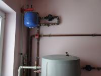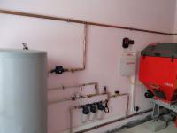 Jak wrócę do domu to wszystko naszkicuję i umieszczę schemat (ja nie mam z tym problemu ;) ) Zbiornik wyrównawczy otwarty umieszczony jest nad kotłem (pod dachem) na zdjęciu nr 2 widoczne są rurki zasilania i przelewu (lecą w górę) Zasilanie (dolanie) wody podłączyli w powrót - zdjęcie nr 2 i 3 - widoczny jest elektrozawór (na prawo od filtrów). W zbiorniku są umieszczone 2 sondy "minimum" i "maximum". Czyjnik poziomu cieczy steruje tym elektrozaworem. Połączenie jest mojego autorstwa i dolewa wodę po osiągnięciu stanu minimalnego a wyłącza przy maxymalnym poziomie. Histereza między sondami wynosi 20 litrów. Zbiornik jest 60 litrowy a poziom maxymalny wynosi 50 litrów. Oczywiście poziomy można w każdej chwili zmienić ale tak na zdrowy rozum myślę, że to akurat jest dobrze ;) Zawór czterodrożny steruje sterownik Defro MZ który jest połączony po RSie ze sterownikiem Defro AG Lux. Obecnie jest otworzony na 100% więc całą wodę puszcza na pompę CO. Tak jak widać na zdjęciu nad pompą nie ma ani odpowietrznika ani zaworu zwrotnego. Połączenie miedź-pex jest widoczne na zdjęciu nr 5 - zasilanie jest w samym rogu i jest widoczny na niej czujnik w siwej osłonie - powrót to ta druga rurka obok. W kanale ciepłowniczym mam: 2 rurki ogrzewania (zasilanie - powrót) 1 zimna woda 1 ciepła woda 1 cyrkulacja Wszystkie 4 skrzynki (2 x podłogówka i 2 x grzejniki) mam podłączone do tych rurek systemem równoległym ( nie wiem jak to się fachowo nazywa :) )