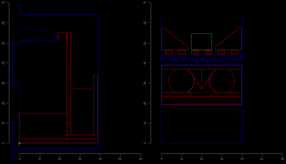 Kolor niebieski to elementy konstrukcyjne kotła, czerwony to płyty i cegły szamotowe, zielony to wejście do palnika wirowego, tzw. port. Nie wszystko jest zaznaczone, ale to już będzie wychodzić w realu. Nie brałem też pod uwagę lekko przechylonego rusztu, to uwzględnię przy docinaniu elementów na gotowo. Wykonałem rysunek z boku, przodu i z góry.
