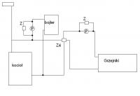 Witam. Mam w domu taką sytuacje jak na rysunku. Grzejniki na wysokości pieca. Czy jeśli podłącze to jak na schemacie będzie wszystko ok? Proszę o opinie i podpowiedzi, zmiany :) ogrzewanie schemat.bmp