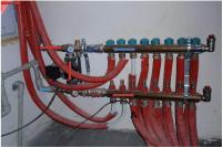 1. Witam, Sorki za pewnie trywialne pytania ale wiem czy do konca mój układ piec vs podłogówka działa porawnie. Piec Defro Duo Plus (sterownik Defro AG firmy Tech) + rozdzielacz KAN77A (8 sekcji). Na chwilę obecna nie posoadam zaworu termostaycznego z kapilatra jak widoczne to jest na zdjeciu. Pierwsze moje wątpliwości wzbudza miejsce podłaczenia czujnika temperatury ogrzewania podłogowego (załaczanie pompy po przekroczeniu min temp zadanej i wyłaczeniu po przekroczeniu max temp). Pytanie moje jest czy czujnik jest wpiety w odpowiednie miejsce? Z tego co sie gdzieś doczytałem to ma by na zasilaniu ale czego wody bezpośrednio z pieca dostaczanej raczej nie bo nigdy nigdy nie załaczy mi pompy (ustawienia pompy min 29 max 31 histereza 2 stopnie na piecu zadana 55 stopni) chyba, że w piecu wygaśnie? Ponadto mógłby mi ktoś z forumowiczów wyjaśnic działanie tego układu na chłopski rozum? Na załaczonym zdjeciu narysowałem jak to po krótce działa. A mianowicie kiedy uruchamiany jest obeg przez by-pass, kiedy woda wraca do pieca? Dlaczego niejednokrotnie obserwuje wyższa temp ma manometrze niebieskim niz czerwonym (nastepuje przepływ wody ciepłej z pieca przez by-pass spowrotem do pieca)? Chciałbym zrozmiec działanie tedo układu bo nie jestem zadowolony z efektów jego działania. Prosze o rady. Dziekuje i pozdrawiam