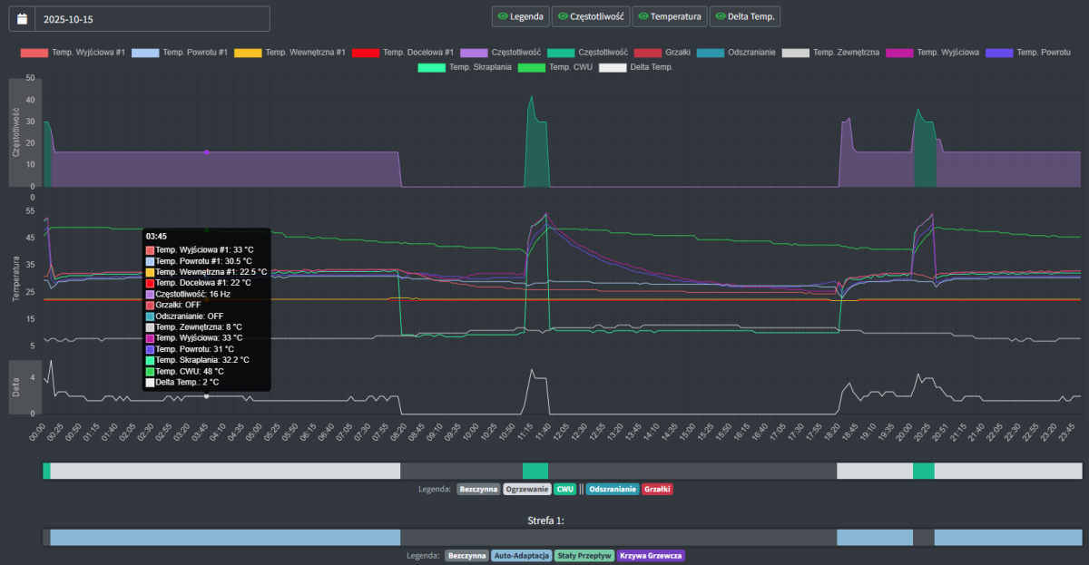 Odnośnie pyrkania na 16Hz to wczoraj na ogrzewaniu COP=4,89, a 11.10 jak było kilka stopni cieplej na zewnątrz to COP=5,84. W skali prawie całego roku (od listopada 2024) wyszło ok 1400 startów i 4210 godzin pracy. Na krzywej było znacznie więcej cykli (mniej "ułożona" praca), natomiast autoadaptacja widać, że dba o komfort pracy i komfort cieplny co może podnieść w jakimś stopniu zużycie energii (może z 10%?/ nie pamiętam już i jakoś o COP nie walczę). Patrząc z drugiej strony to te pompy w naszym coraz cieplejszym klimacie się po prostu marnują. Przy 10C to każda może się wykazać, przy -15C i niżej to już niewiele radzi sobie bez grzałek. -