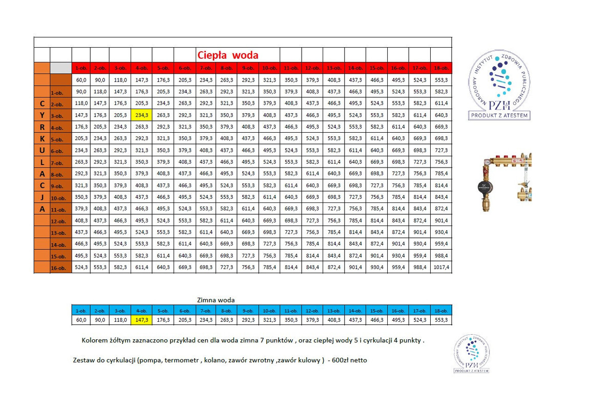 Witam serdecznie szanowne grono , poniżej zamieszczam nowy cennik na rozdzielacze do wody użytkowej . Bardzo mi miło poinformować, że od dzisiaj obniżyliśmy ceny na cały rozdzielacz z grupą pompową do cyrkulacji , żeby było Wam lepiej dobierać obwody to w tabelce zamieszczone są ceny belek na ciepłą wodę + cyrkulacja , poniżej znajdują się ceny na belkę na zimną wodę i osobno można zamówić grupę pompową do cyrkulacji , która składa się z( pompy Grundfos z pół-śrubunkami , zaworu zwrotnego , kolana z termometrem , i zaworu kulowego ) . Wszystkie ceny są cenami netto, wysyłka jest gratis za pobraniem lub przedpłata i oczywiście dla osób z tego forum , na hasło ,, info-ogrzewanie " od tych cen będzie udzielany 10% rabatu . Pozdrawiam Tomekb.- 111 odpowiedzi
