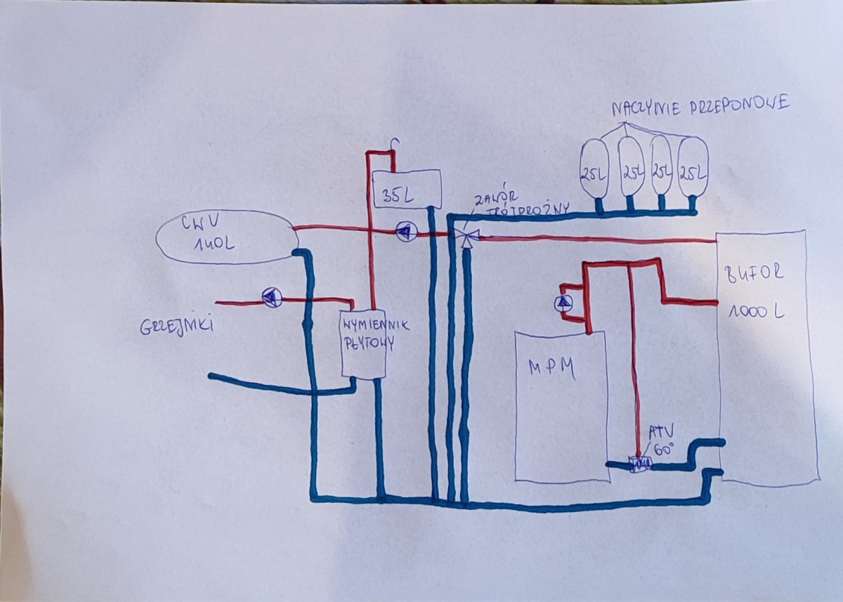 Dzięki. O czymś takim właśnie myślałem. Zastanawiam się jeszcze nad wyjściem z bufora na samej górze. Myślę, że gorąca woda z bufora byłaby lepiej wykorzystana.