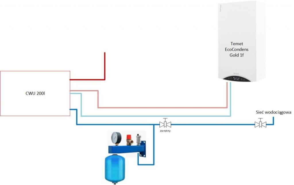 Witam, Potrzebuję zabezpieczyć zasilanie bojlera 200l naczyniem przeponowym i zaworem bezpieczeństwa. Czy takie podłączenie jak na rysunku jest prawidłowe? Czy umiejscowienie grupy bezpieczeństwa i naczynia, poniżej bojlera ma znaczenie? -