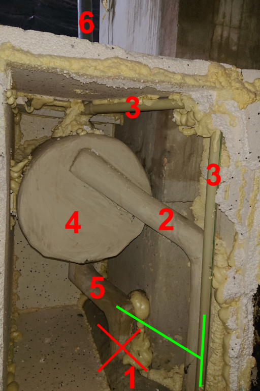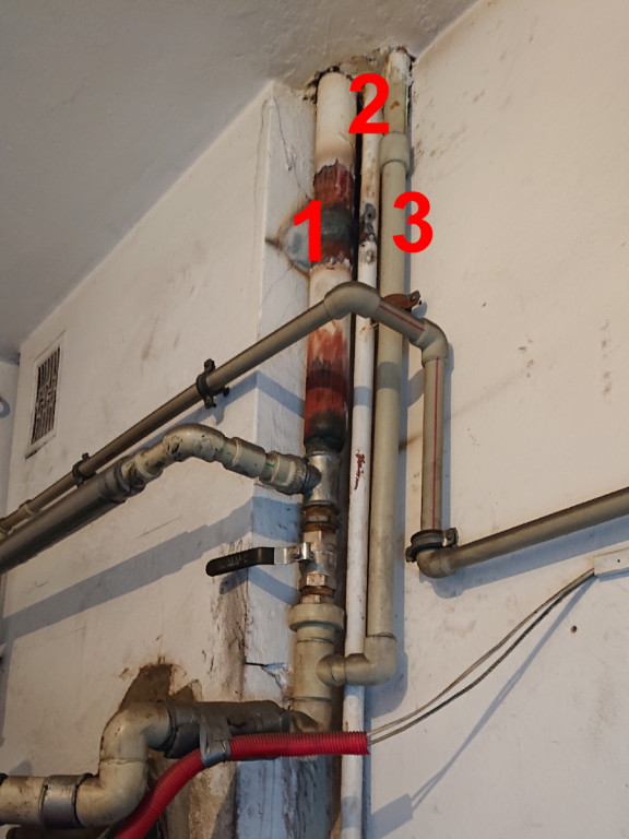 2. Proszę o pomoc w rozwiązaniu problemu... Według mnie "fachowcy" spierniczyli robotę... Instalacja CO w układzie otwartym, z rozdziałem górnym, pompa na zasileniu... Pierwsze zdjęcie (kotłownia - K1): 1. Czynnik grzewczy (pompa na zasileniu) - rura wędruje na poddasze skąd woda rozprowadzana jest do grzejników 2. Rura sygnalizacyjna (nadmiar wody w zbiorniku wylewany do instalacji kanalizacyjnej) 3. Powinna to być rura bezpieczeństwa (kiedyś jej nie było, została doprowadzona na poddasze) Drugie zdjęcie (poddasze - P1): 1. Doprowadzenie ciepłej wody na poddasze, celem rozprowadzenia na grzejniki, 2. Rura sygnalizacyjna (nadmiar wody w zbiorniku wylewany do instalacji kanalizacyjnej) 3. Powinna to być rura bezpieczeństwa (kiedyś jej nie było, została doprowadzona na poddasze) 4. Zbiornik przelewowy 5. Pierwotne (istniejące nadal) połączenie zbiornika przelewowego z zasileniem instalacji - coś co chyba miało pełnić rolę rury bezpieczeństwa 6. Odpowietrzenie zbiornika (trójnik łączący z prawej strony 3, góra odpowietrzenie, dół - do zbiornika) Dość często mam problem z zapowietrzaniem całej instalacji - prawdopodobnie w momencie przymknięcia zaworów termostatycznych na grzejnikach rośnie temp wody w instalacji i zwiększa się jej objętość, po czym następuje wyrzut nadmiaru wody CO, jak się otworzą, woda zmniejsza objętość i z tego dziwnego obecnego układu prawdopodobnie zasysane jest powietrze do instalacji... Czy dobrze myślę, że powinienem kawałek rury (nr 5) rozciąć, zaślepić od strony zasilenia a ten koniec od strony zbiornika trójnikiem połączyć z rurą bezpieczeństwa (nr 3) - zdjęcie nr 3 (P2)? Czy to pomoże wyeliminować zapowietrzanie? Przeanalizowałem całość i chyba tylko to mi pozostaje... Choć mogę się mylić... Sam już nie wiem... Pomóżcie proszę